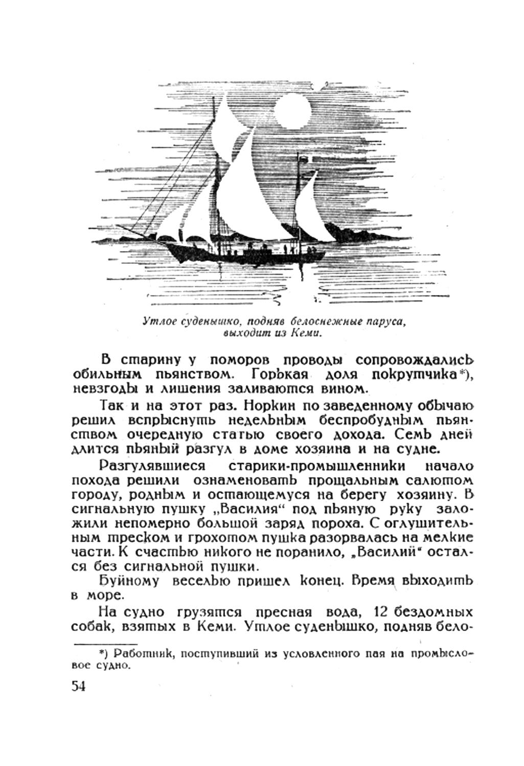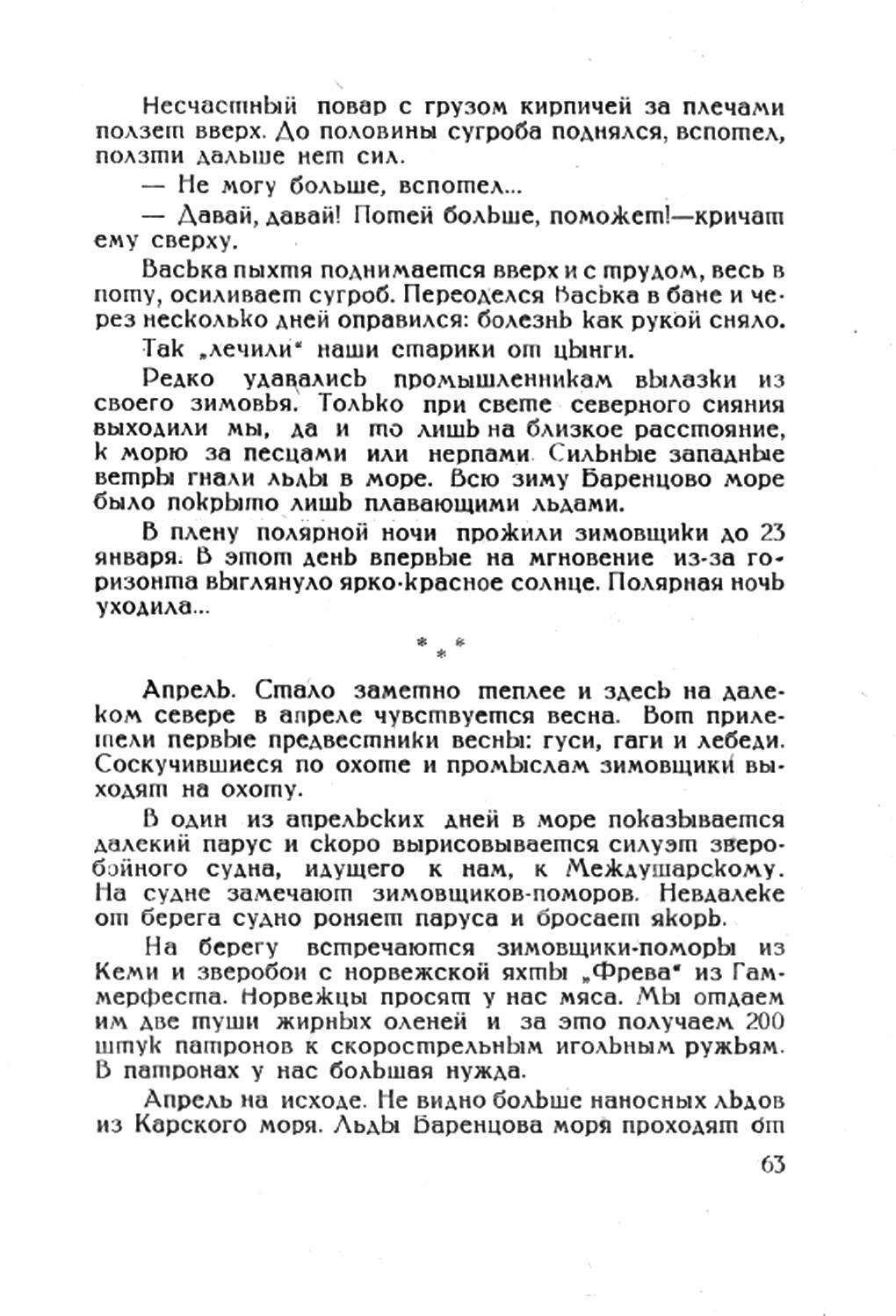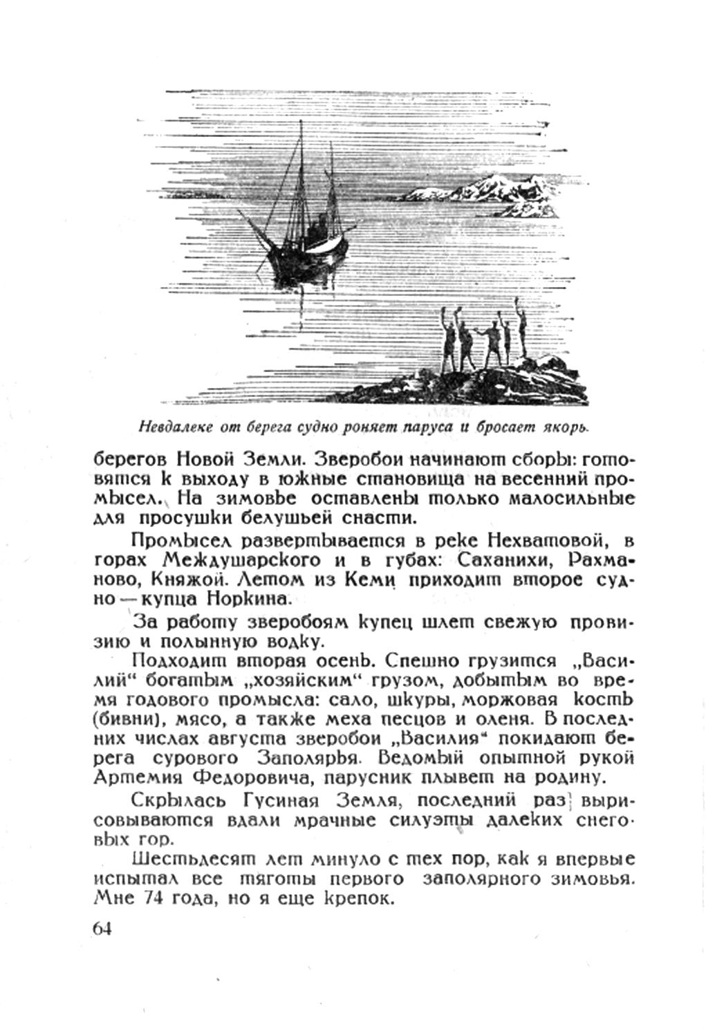 Нужда и голод гнали на борьбу за неистощимее богатства Севера, в рискованные заполярные плавания сотни поморов-промыш-ленников. К числу их принадлежал и я. Еще 16-летним юношей отправился я на утлом паруснике кемского купца-судопромышленника Норкина матросом на промыслы, на зимовку к берегам Новой Земли.