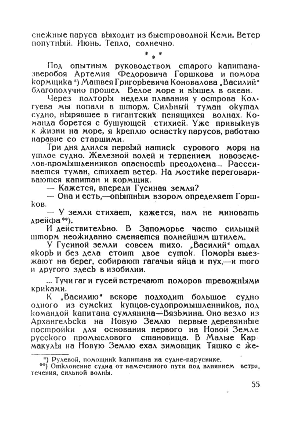 *) Рулевой, помощник капитана на судне-паруснике.**) Отклонение судна от намеченного пути под влиянием ветра, течения, сильной волны.... Тучи гаги гусей встречают поморов тревожными криками.