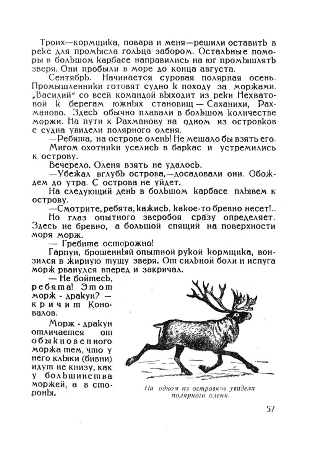 Сентябрь. Начинается суровая полярная осень. Промышленники готовят судно к походу за моржами. "Василий" со всей командой выходит из реки Нехватовой к берегам южных становищ — Саханихи, Рах-маново. Здесь обычно плавали в большом количестве моржи. Па пути к Рахманову на одном из островков с судна увидели полярного оленя.