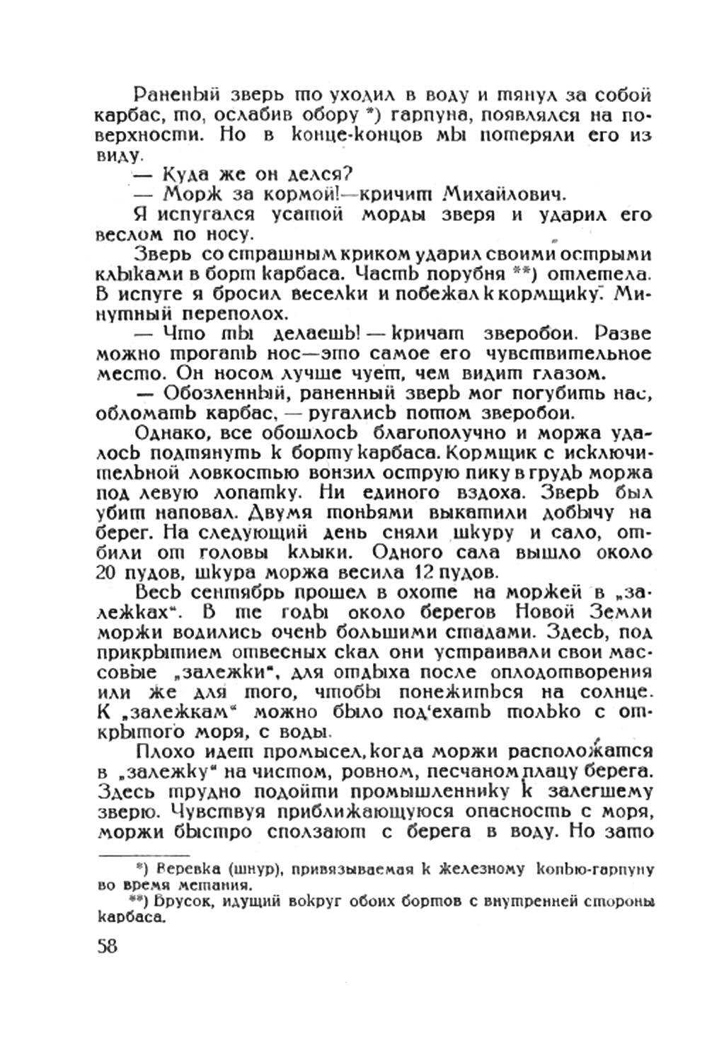 Зверь со страшным криком ударил своими острыми клыками в борт карбаса. Часть порубня **) отлетела. В испуге я бросил веселки и побежал к кормщику. Минутный переполох.