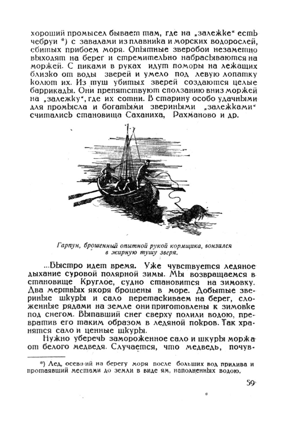 *) Веревка (шнур), привязываемая к железному копью-гарпуну во время метания.**) Брусок, идущий вокруг обоих бортов с внутренней стороны карбаса.хороший промысел бывает там, где на „залежке есть чебруи *) с завалами из плавника и морских водорослей, сбитых прибоем моря. Опытные зверобои незаметно выходят на берег и стремительно набрасываются на моржей. С пиками в руках идут поморы на лежащих близко от воды зверей и умело под левую лопатку колют их. Из туш убитых зверей создаются целые баррикады. Они препятствуют сползанию вниз моржей на "залежку", где их сотни. В старину особо удачными для промысла и богатыми звериными "залежками" считались становища Саханиха, Рахманово и др.