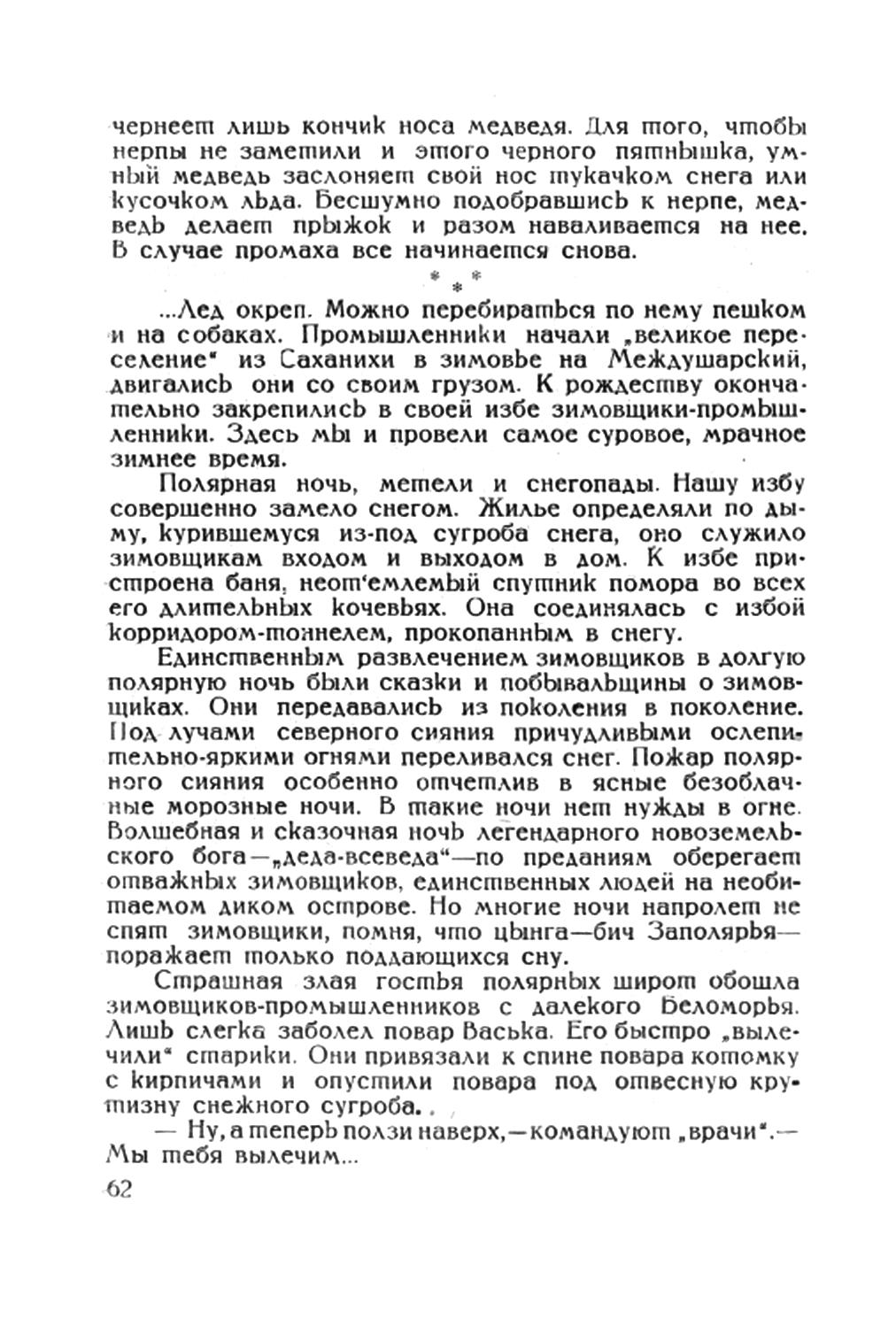 Страшная злая гостья полярных широт обошла зимовщиков-промышленников с далекого Беломорья. Лишь слегка заболел повар Васька. Его быстро "вылечили" старики. Они привязали к спине повара котомку с кирпичами и опустили повара под отвесную крутизну снежного сугроба..