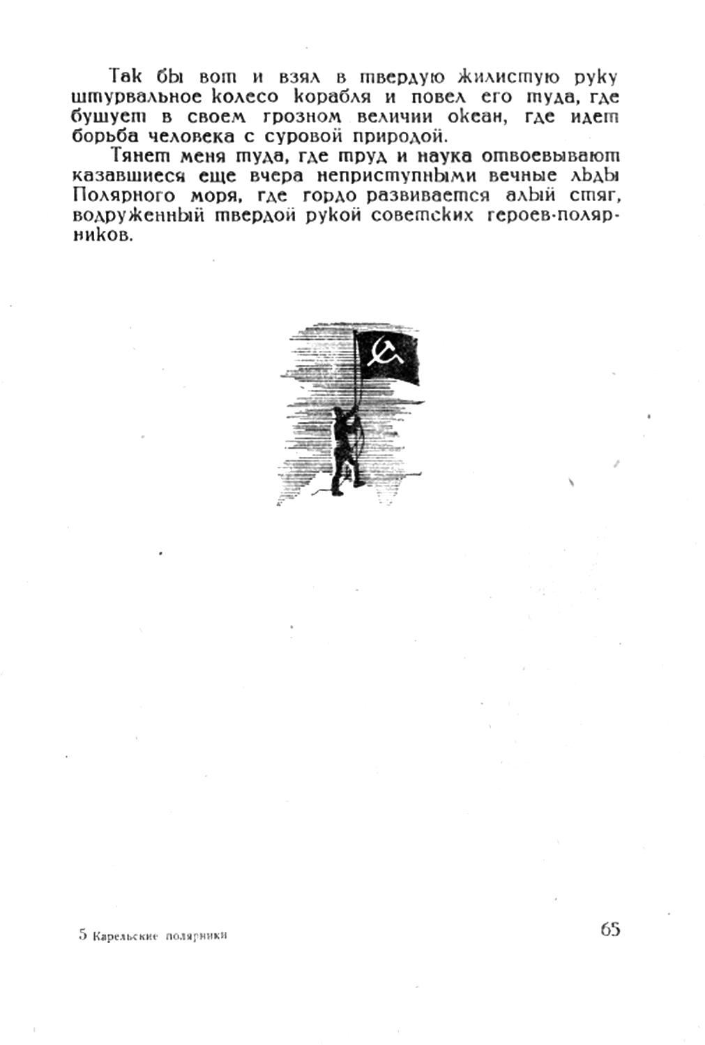 Тянет меня туда, где труд и наука отвоевывают казавшиеся еще вчера неприступными вечные льды Полярного моря, где гордо развивается алый стяг, водруженный твердой рукой советских героев-полярников.
