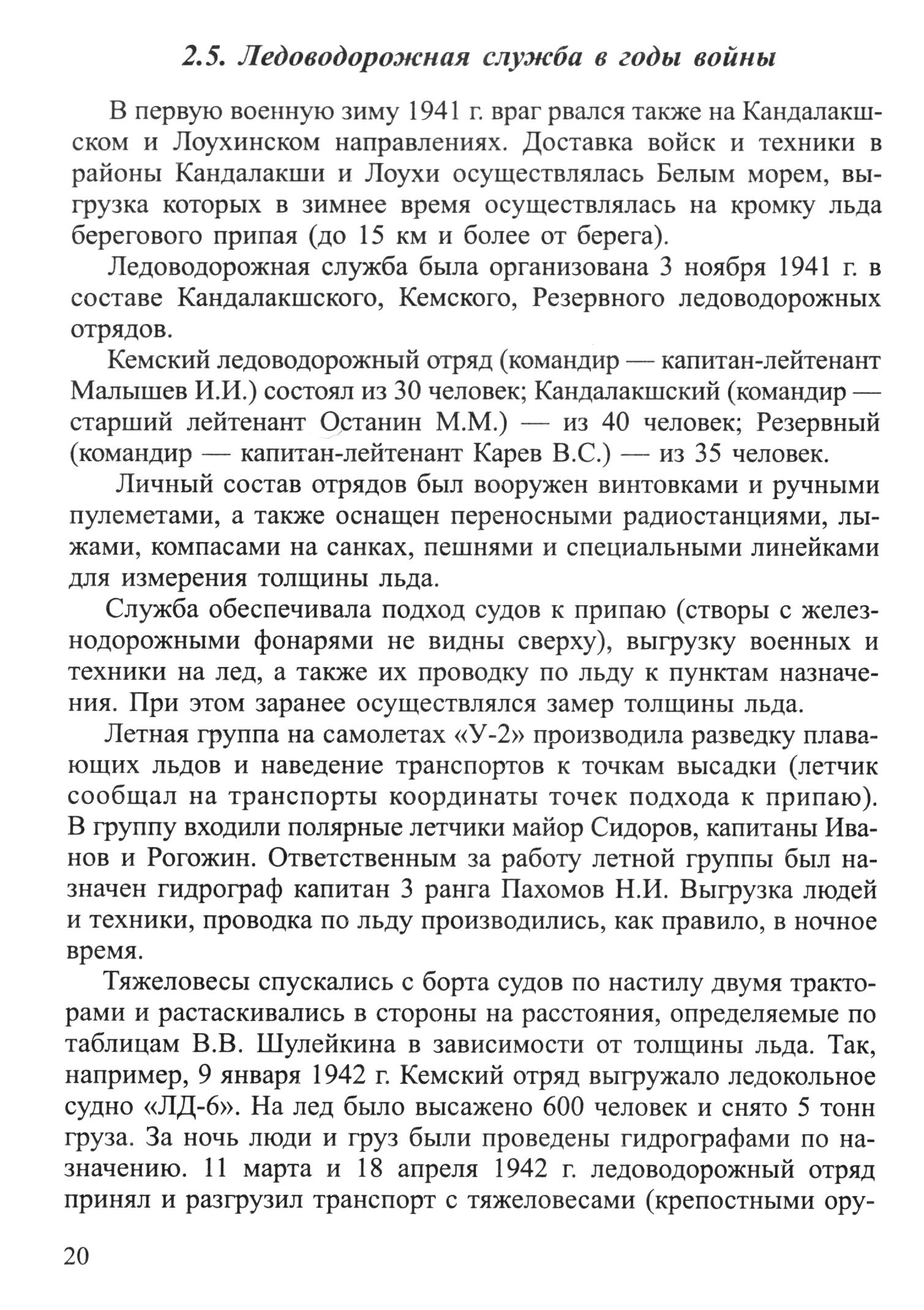2. 5. Ледоводорожная служба в годы войныВ первую военную зиму 1941 г. враг рвался также на Кандалакшском и Лоухинском направлениях. Доставка войск и техники в районы Кандалакши и Лоухи осуществлялась Белым морем, выгрузка которых в зимнее время осуществлялась на кромку льда берегового припая (до 15 км и более от берега).