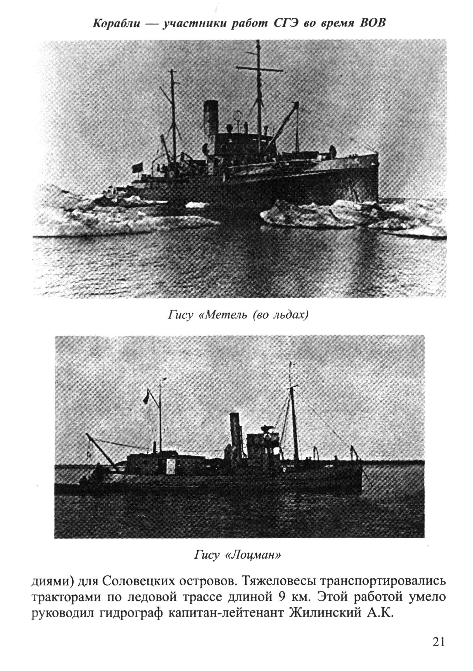 Корабли — участники работ СГЭ во время ВОВГису «Метель (во льдах)Гису «Лоцман»диями) для Соловецких островов. Тяжеловесы транспортировались тракторами по ледовой трассе длиной 9 км. Этой работой умело руководил гидрограф капитан-лейтенант Жилинский А. К.