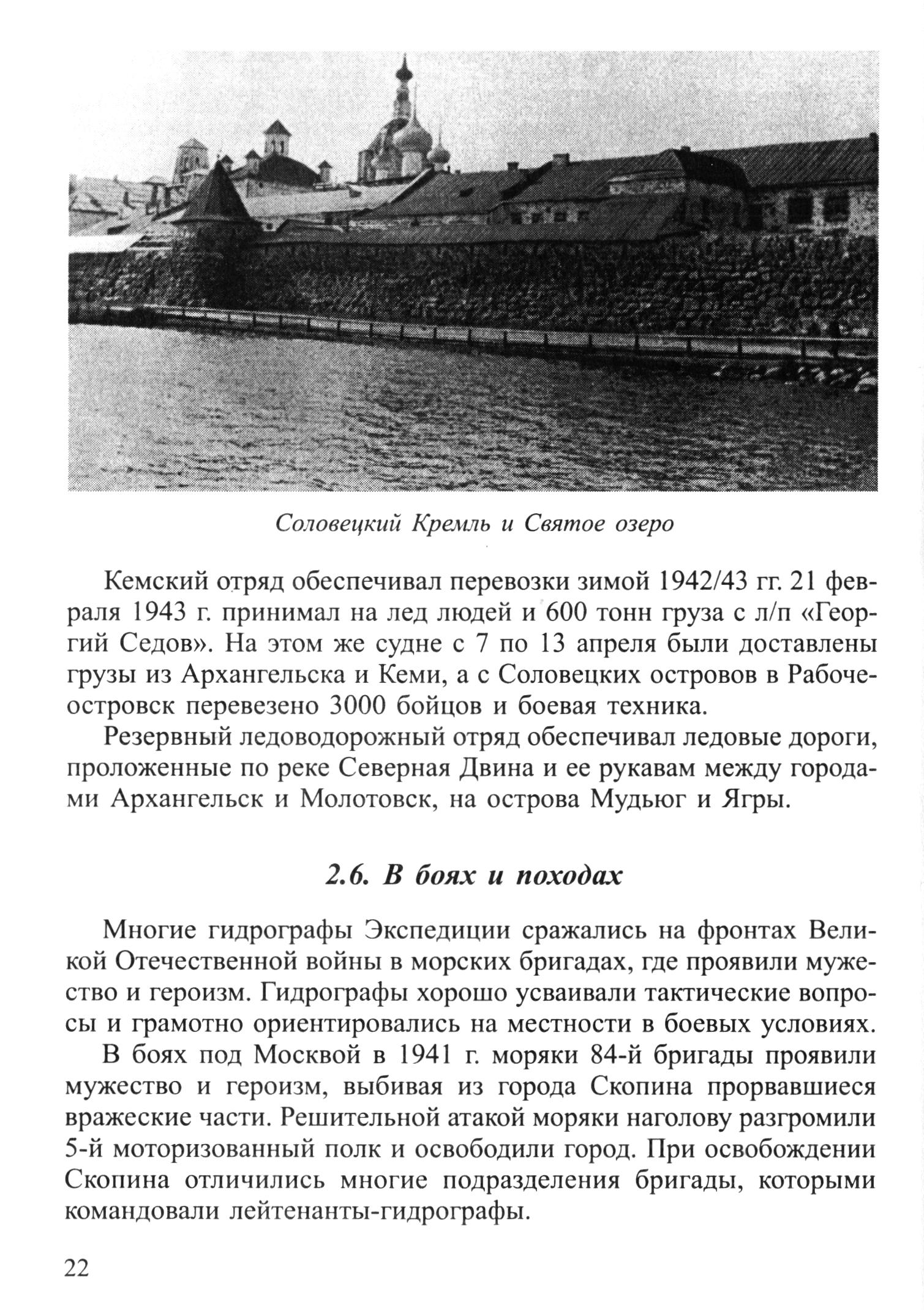 Соловецкий Кремль и Святое озероКемский отряд обеспечивал перевозки зимой 1942/43 гг. 21 февраля 1943 г. принимал на лед людей и 600 тонн груза с л/п «Георгий Седов». На этом же судне с 7 по 13 апреля были доставлены грузы из Архангельска и Кеми, а с Соловецких островов в Рабочеостровск перевезено 3000 бойцов и боевая техника.