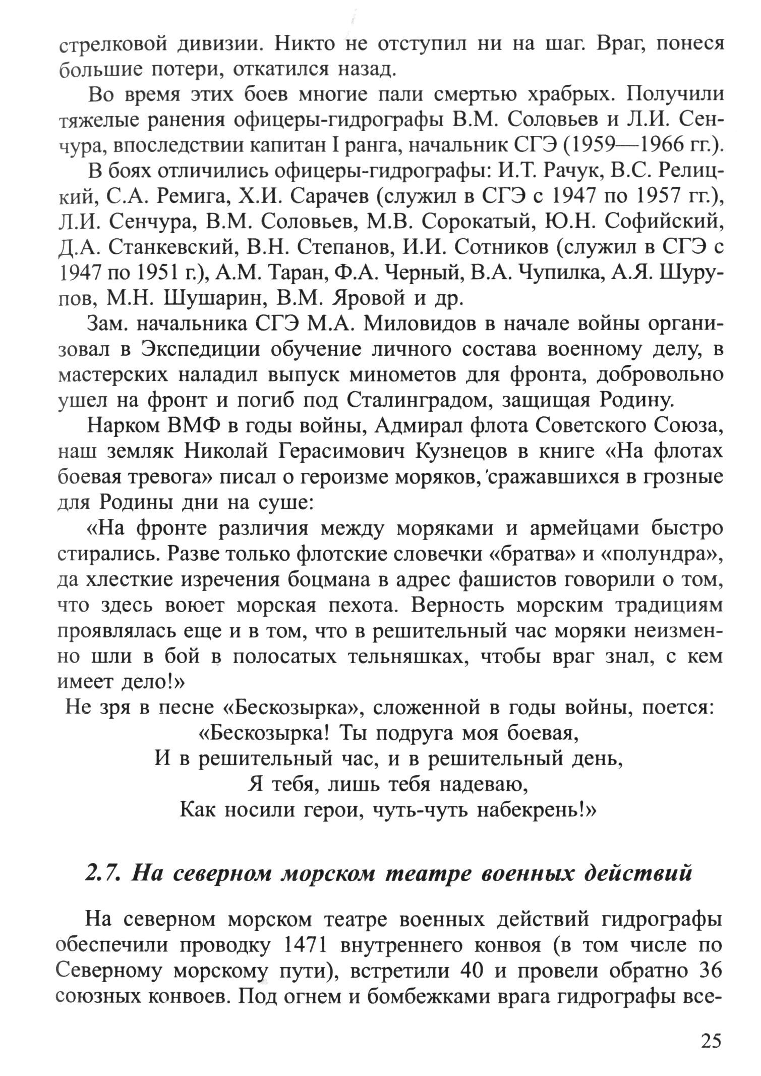 2.7. На северном морском театре военных действийНа северном морском театре военных действий гидрографы обеспечили проводку 1471 внутреннего конвоя (в том числе по Северному морскому пути), встретили 40 и провели обратно 36 союзных конвоев. Под огнем и бомбежками врага гидрографы все-