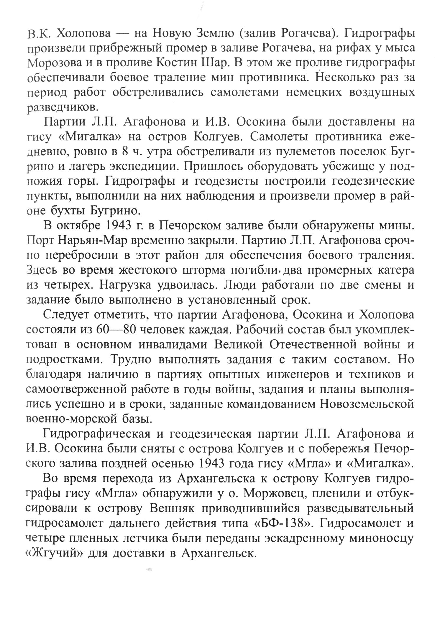 Гидрографическая и геодезическая партии Л. П. Агафонова и И. В. Осокина были сняты с острова Колгуев и с побережья Печорского залива поздней осенью 1943 года гису «Мгла» и «Мигалка».