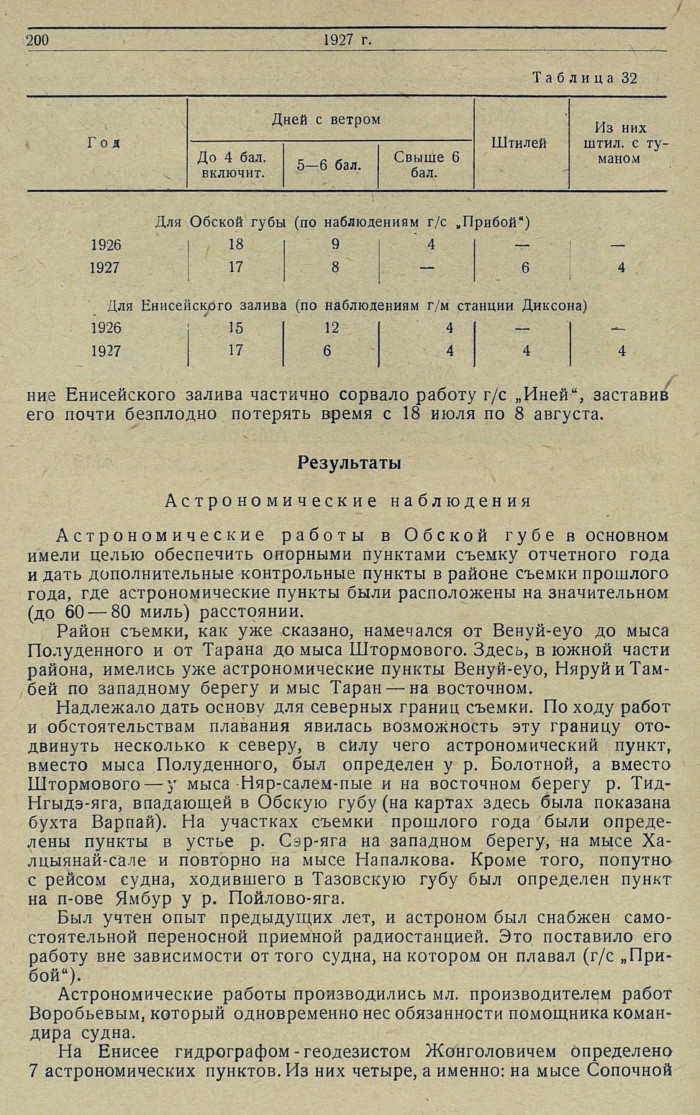 РезультатыАстрономические наблюденияАстрономические работы в Обской губе в основном имели целью обеспечить опорными пунктами съемку отчетного года и дать дополнительные контрольные пункты в районе съемки прошлого года, где астрономические пункты были расположены на значительном (до 60 — 80 миль) расстоянии.