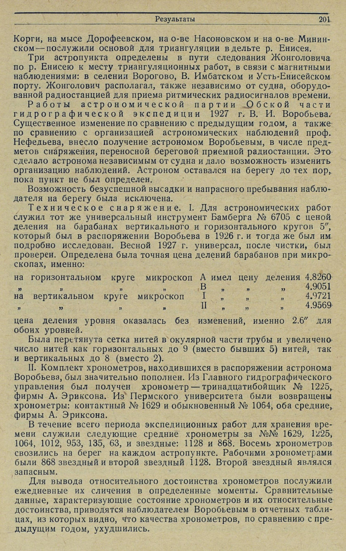 Работы астрономической партии Обской части гидрографической экспедиции 1927 г. В. И. Воробьева. Существенное изменение по сравнению с предыдущим годом, а также по сравнению с организацией астрономических наблюдений проф. Нефедьева, внесло получение астрономом Воробьевым, в числе предметов снаряжения, переносной береговой приемной радиостанции. Это сделало астронома независимым от судна и дало возможность изменить организацию наблюдений. Астроном оставался на берегу до тех пор, пока пункт не был определен.