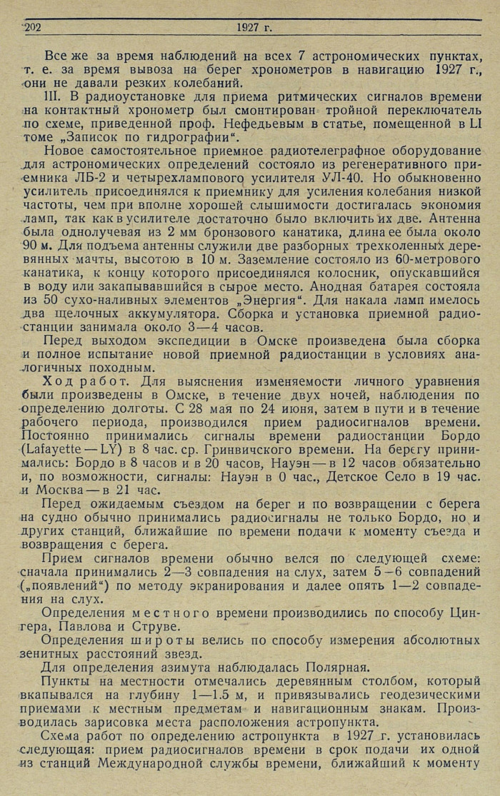 Схема работ по определению астропункта в 1927 г. установилась следующая: прием радиосигналов времени в срок подачи их одной из станций Международной службы времени, ближайший к моменту