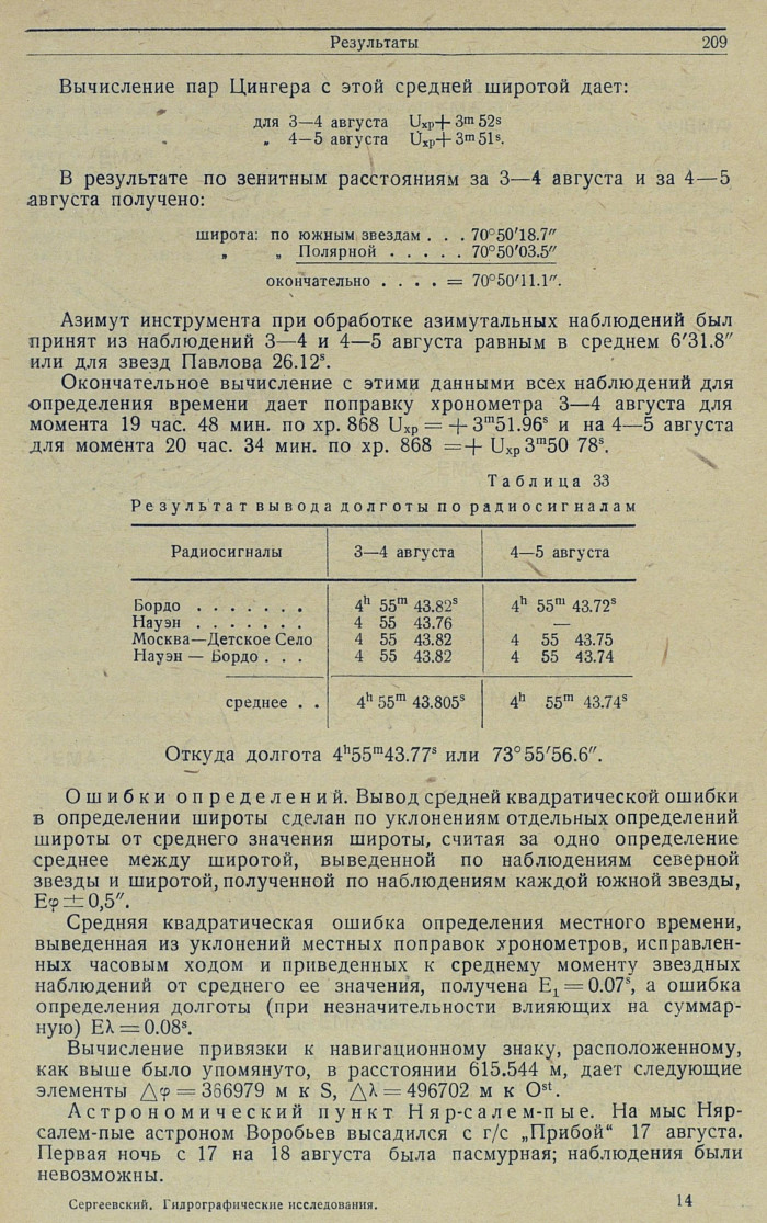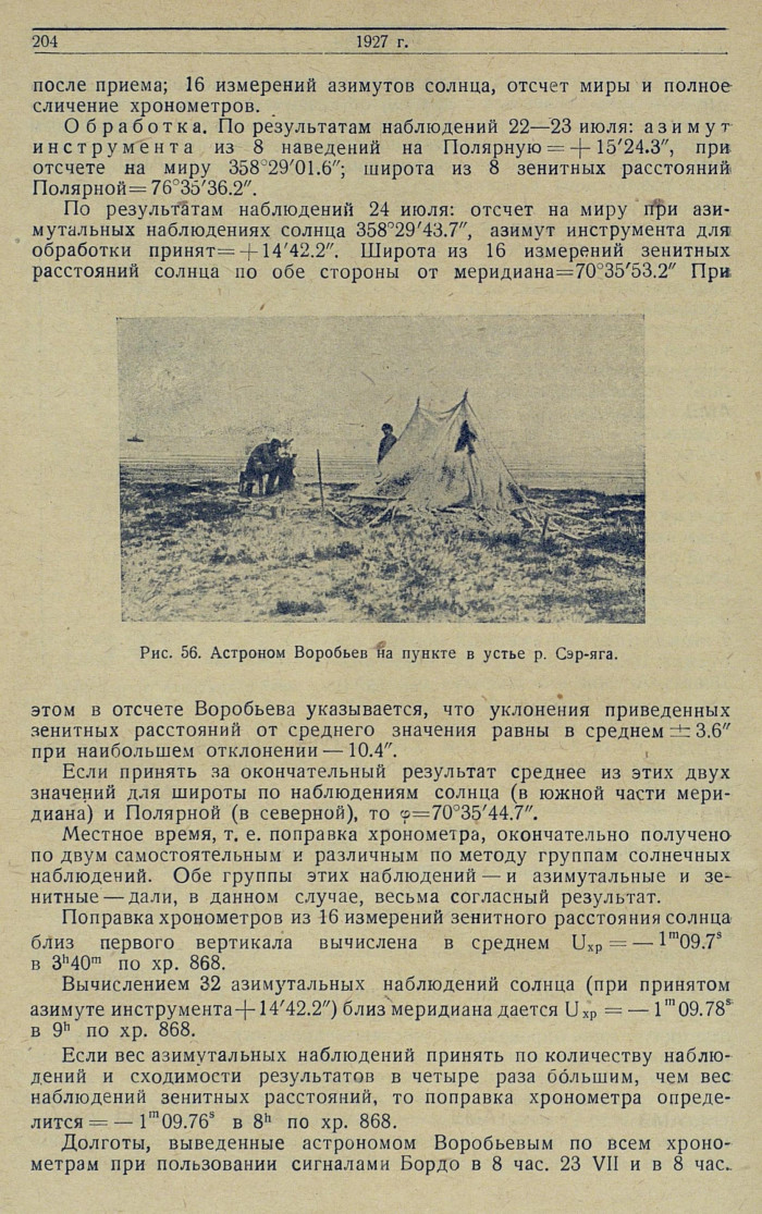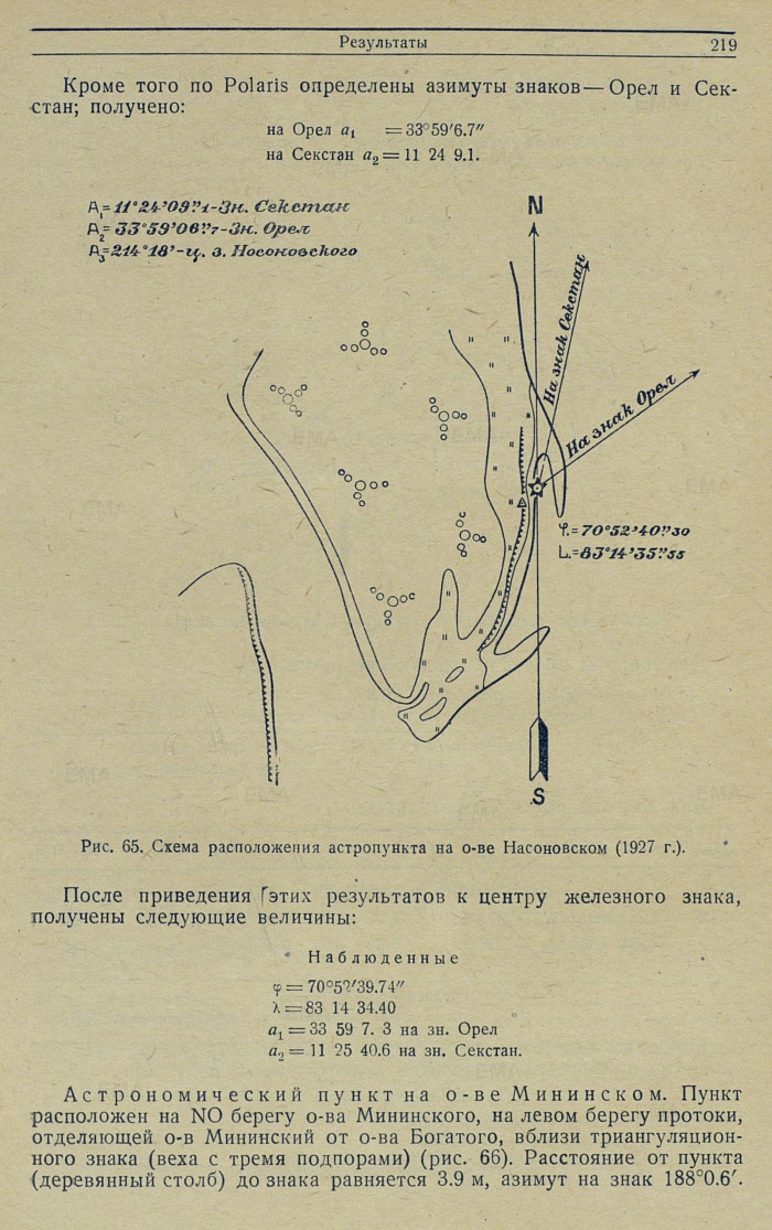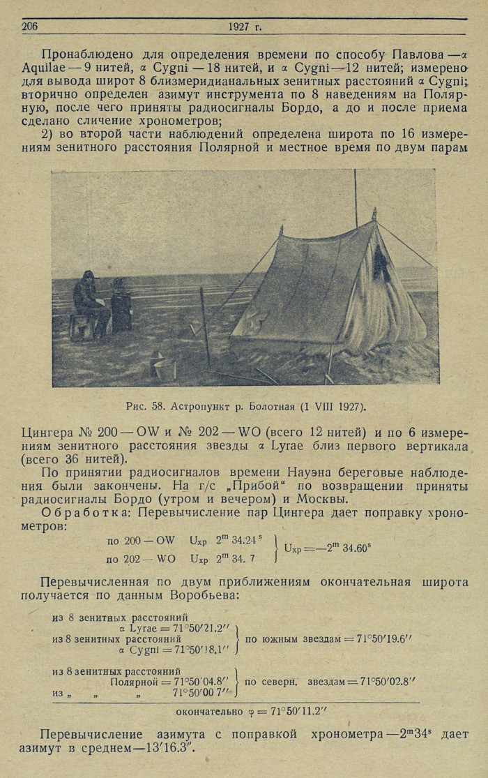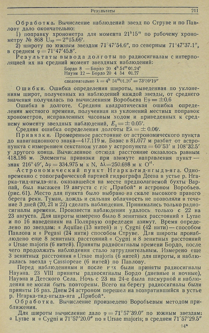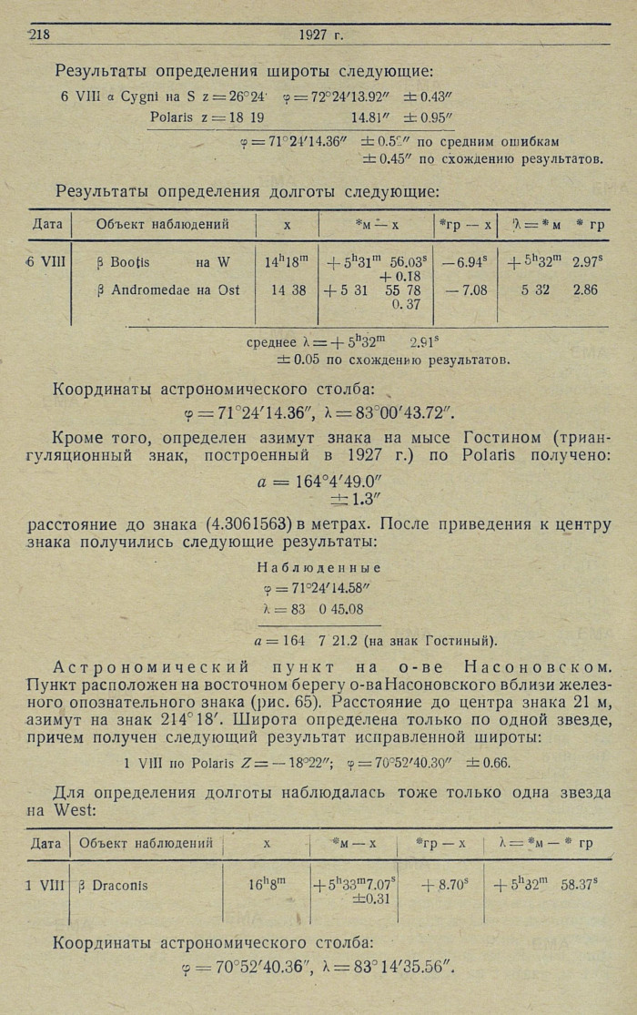Обработка. По результатам наблюдений 22—23 июля: азимут инструмента из 8 наведений на Полярную = ±15'24.3", при отсчете на миру 358°29'01.6"; широта из 8 зенитных расстояний Полярной = 76°35'36.2".
