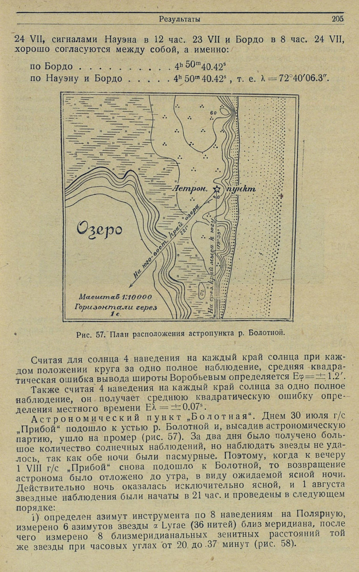 Астрономический пункт „Болотная". Днем 30 июля г/с „Прибой" подошло к устью р. Болотной и, высадив астрономическую партию, ушло на промер (рис. 57). За два дня было получено большое количество солнечных наблюдений, но наблюдать звезды не удалось, так как обе ночи были пасмурные. Поэтому, когда к вечеру 1 VIII г/с „Прибой" снова подошло к Болотной, то возвращение астронома было отложено до утра, в виду ожидаемой ясной ночи. Действительно ночь оказалась исключительно ясной, и 1 августа звездные наблюдения были начаты в 21 час. и проведены в следующем порядке: