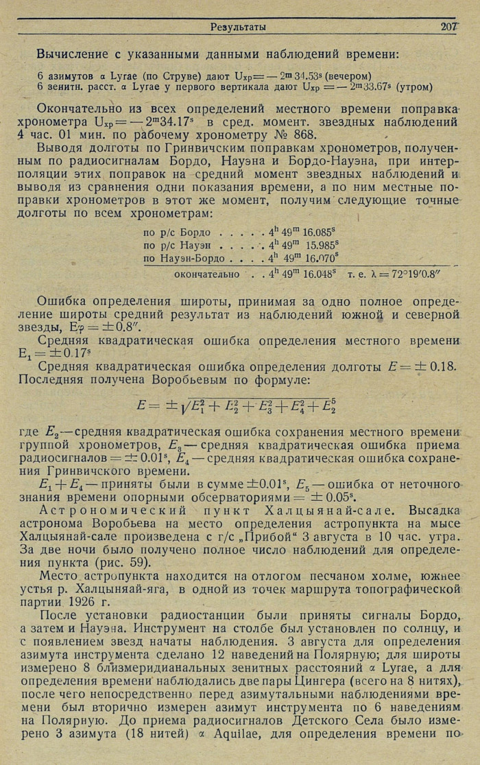 Считая для солнца 4 наведения на каждый край солнца при каждом положении круга за одно полное наблюдение, средняя квадратическая ошибка вывода широты Воробьевым определяется Εφ= ±1.2'.