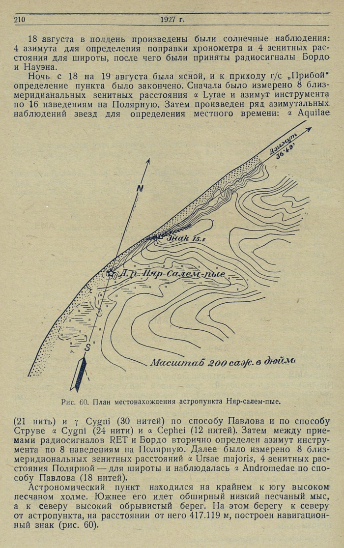 Надлежало дать основу для северных границ съемки. По ходу работ и обстоятельствам плавания явилась возможность эту границу отодвинуть несколько к северу, в силу чего астрономический пункт, вместо мыса Полуденного, был определен у р. Болотной, а вместо Штормового — у мыса Няр-салем-пые и на восточном берегу р. Тид-Нгыдэ-яга, впадающей в Обскую губу (на картах здесь была показана бухта Варпай). На участках съемки прошлого года были определены пункты в устье р. Сэр-яга на западном берегу, на мысе Халцыянай-сале и повторно на мысе Напалкова. Кроме того, попутно с рейсом судна, ходившего в Тазовскую губу был определен пункт на п-ове Ямбур у р. Пойлово-яга.