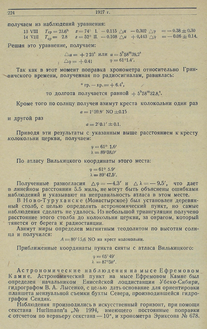 Местное время, т. е. поправка хронометра, окончательно получено по двум самостоятельным и различным по методу группам солнечных наблюдений. Обе группы этих наблюдений — и азимутальные и зенитные — дали, в данном случае, весьма согласный результат.