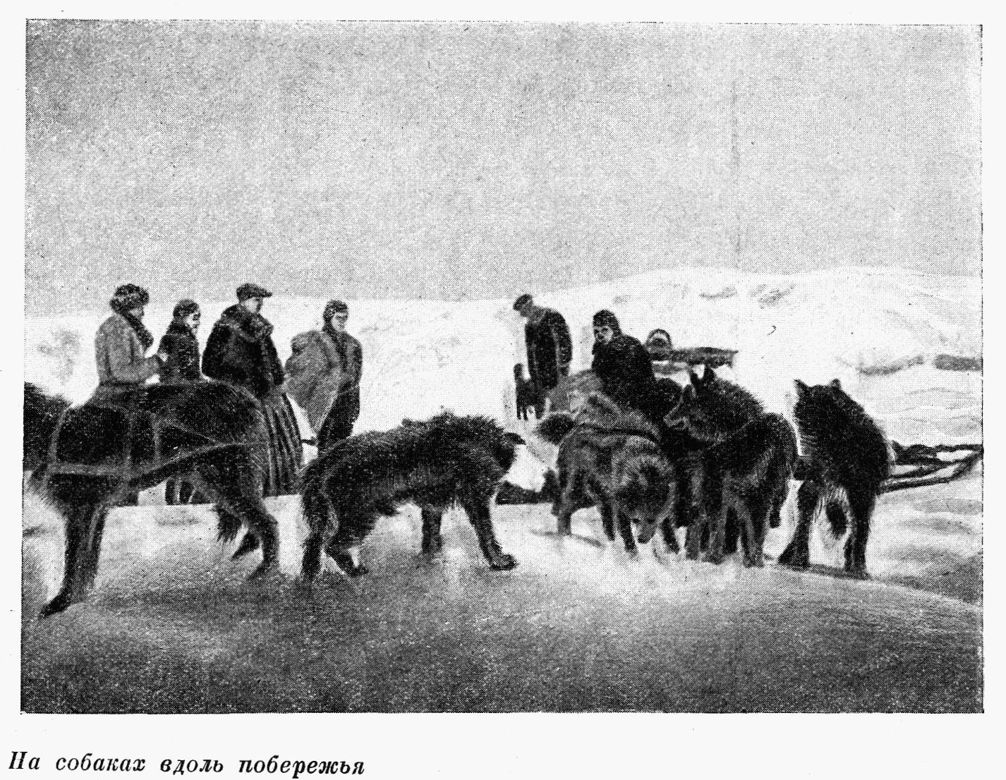 12 апреля мы выехали рано утром на шести нартах. Я еду с Наего. У него прекрасные собаки. Едем мы быстро. Путь лежит вдоль Колючинского залива.