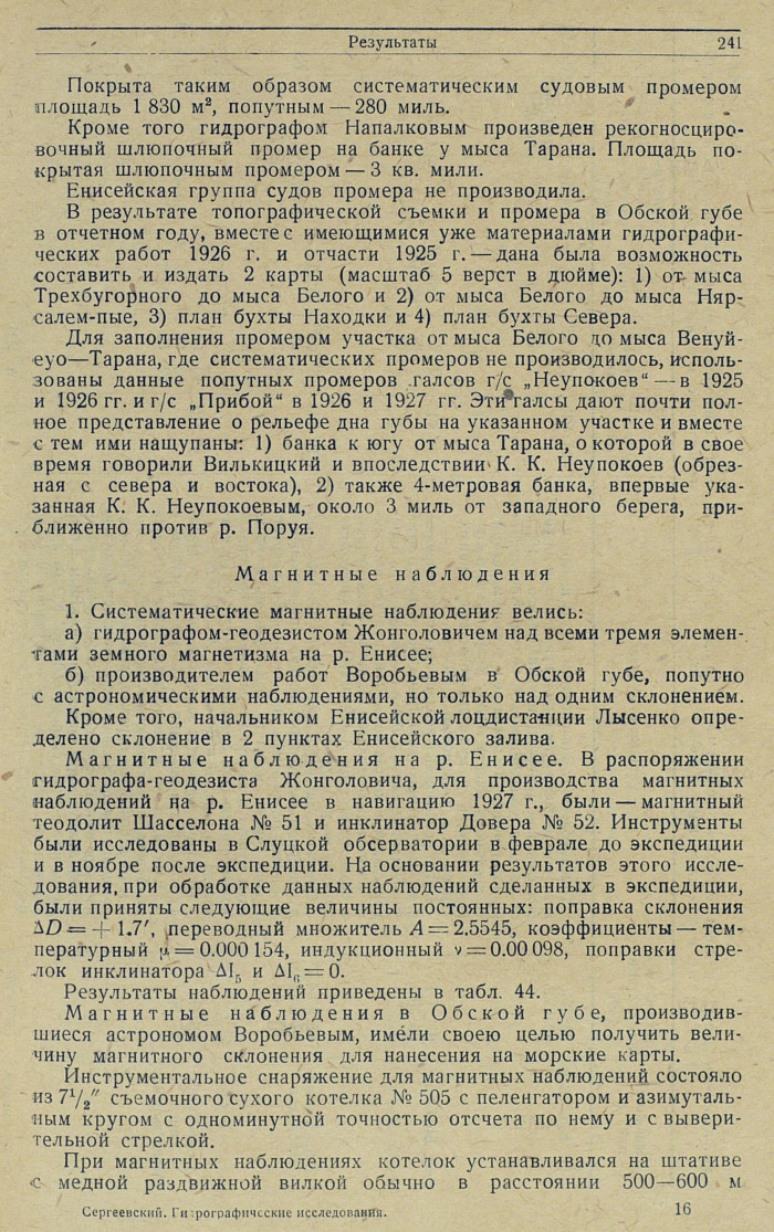 Магнитные наблюдения на р. Енисее. В распоряжении гидрографа-геодезиста Жонголовича, для производства магнитных наблюдений на р. Енисее в навигацию 1927 г., были — магнитный теодолит Шасселона № 51 и инклинатор Довера № 52. Инструменты были исследованы в Слуцкой обсерватории в феврале до экспедиции и в ноябре после экспедиции. На основании результатов этого исследования, при обработке данных наблюдений сделанных в экспедиции, были приняты следующие величины постоянных: поправка склонения ΔD = +1.7', переводный множитель А = 2.5545, коэффициенты — температурный μ = 0.000154, индукционный v = 0.00098, поправки стрелок инклинатора ΔΙ5 и ΔΙ6 = 0.
