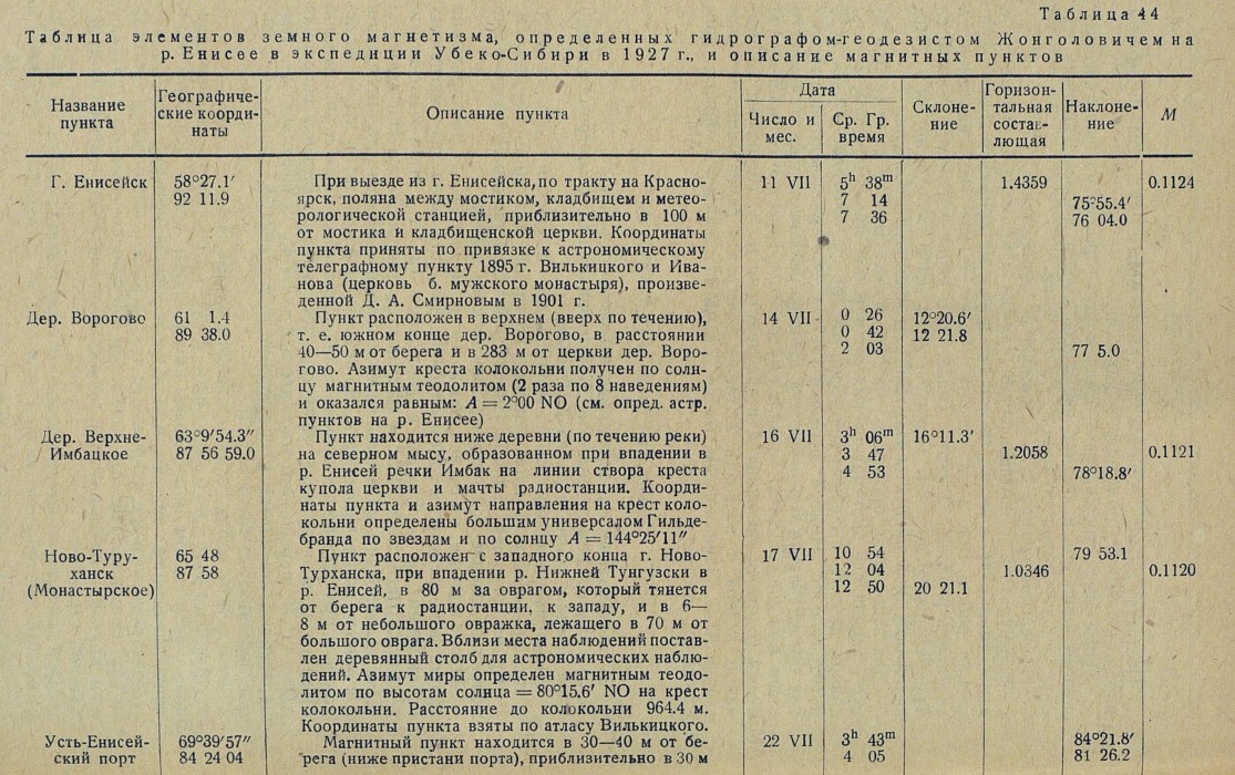 Таблица элементов земного магнетизма, определенных гидрографом-геодезистом Жонголовичем на р. Енисее в экспедиции Убеко-Сибири в 1927 г., и описание магнитных пунктов