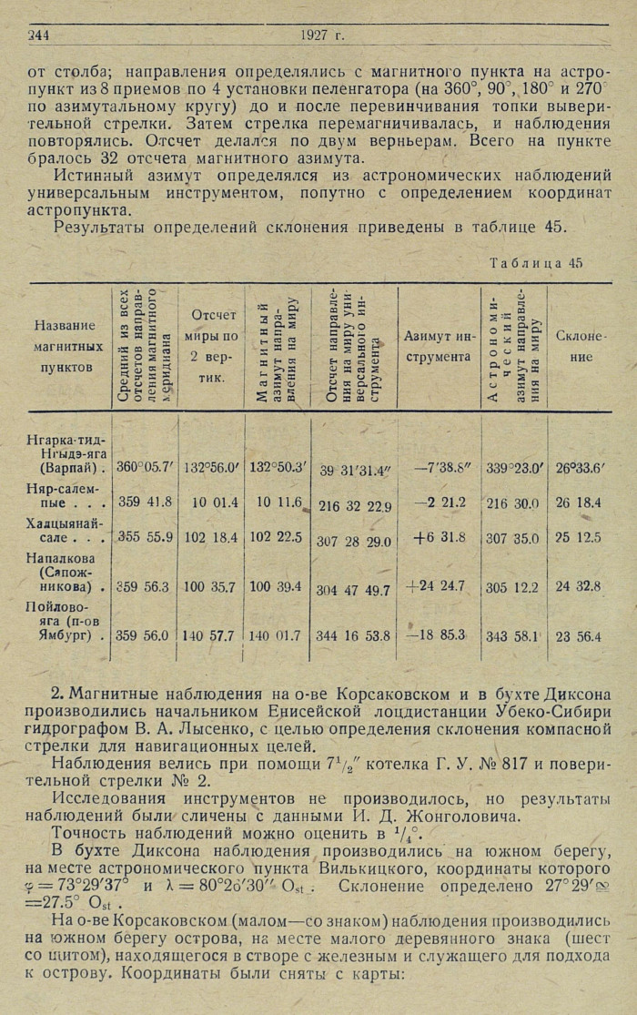 2. Магнитные наблюдения на о-ве Корсаковском и в бухте Диксона производились начальником Енисейской лоцдистанции Убеко-Сибири гидрографом В. А. Лысенко, с целью определения склонения компасной стрелки для навигационных целей.