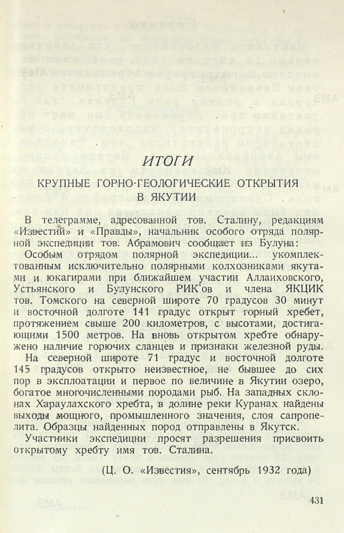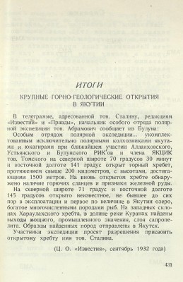 Особым отрядом полярной экспедиции... укомплектованным исключительно полярными колхозниками якутами и юкагирами при ближайшем участии Аллаиховского, Устьянского и Булунского РИК’ов и члена ЯКЦИК тов. Томского на северной широте 70 градусов 30 минут и восточной долготе 141 градус открыт горный хребет, протяжением свыше 200 километров, с высотами, достигающими 1500 метров. На вновь открытом хребте обнаружено наличие горючих сланцев и признаки железной руды.