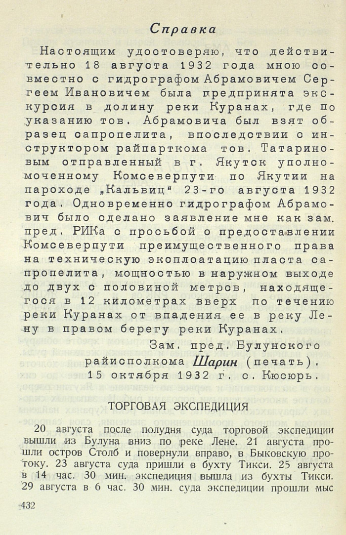 Настоящим удостоверяю, что действительно 18 августа 1932 года мною совместно с гидрографом Абрамовичем Сергеем Ивановичем была предпринята экскурсия в долину реки Куранах, где по указанию тов. Абрамовича был взят образец сапропелита, впоследствии с инструктором райпарткома тов. Татариновым отправленный в г. Якутск уполномоченному Комсеверпути по Якутии на пароходе „Кальвиц“ 23-го августа 1932 года. Одновременно гидрографом Абрамович было сделано заявление мне как зам. пред. РИКа с просьбой о предоставлении Комсеверпути преимущественного права на техническую эксплоатацию пласта сапропелита, мощностью в наружном выходе до двух с половиной метров, находящегося в 12 километрах вверх по течению реки Куранах от впадения ее в реку Лену в правом берегу реки Куранах.