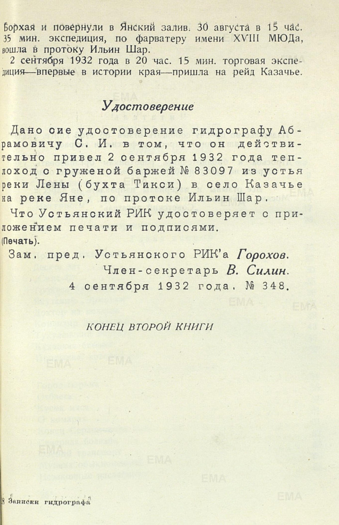Дано сие удостоверение гидрографу Абрамовичу С. И. в том, что он действительно привел 2 сентября 1932 года теплоход с груженой баржей № 83097 из устья реки Лены (бухта Тикси) в село Казачье на реке Яне, по протоке Ильин Шар.