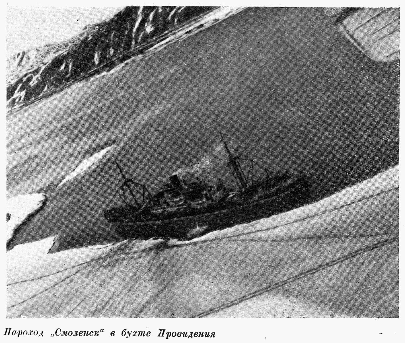 Пришли в бухту Провидения. Начинается погрузка самолетов. Бухта не широкая, по обе стороны ее большие горы. Здесь льда уже совсем мало. Пролетают большие стаи уток. Погода очень теплая.