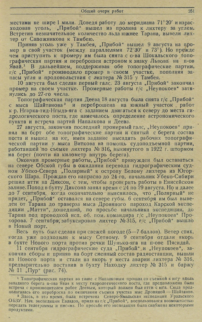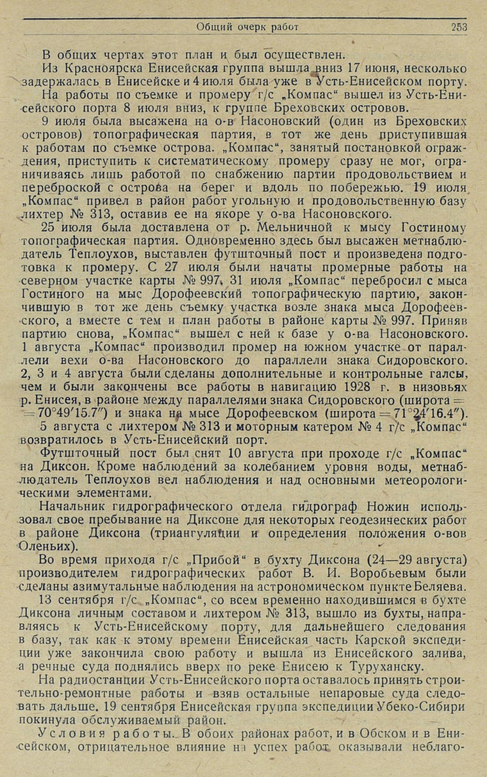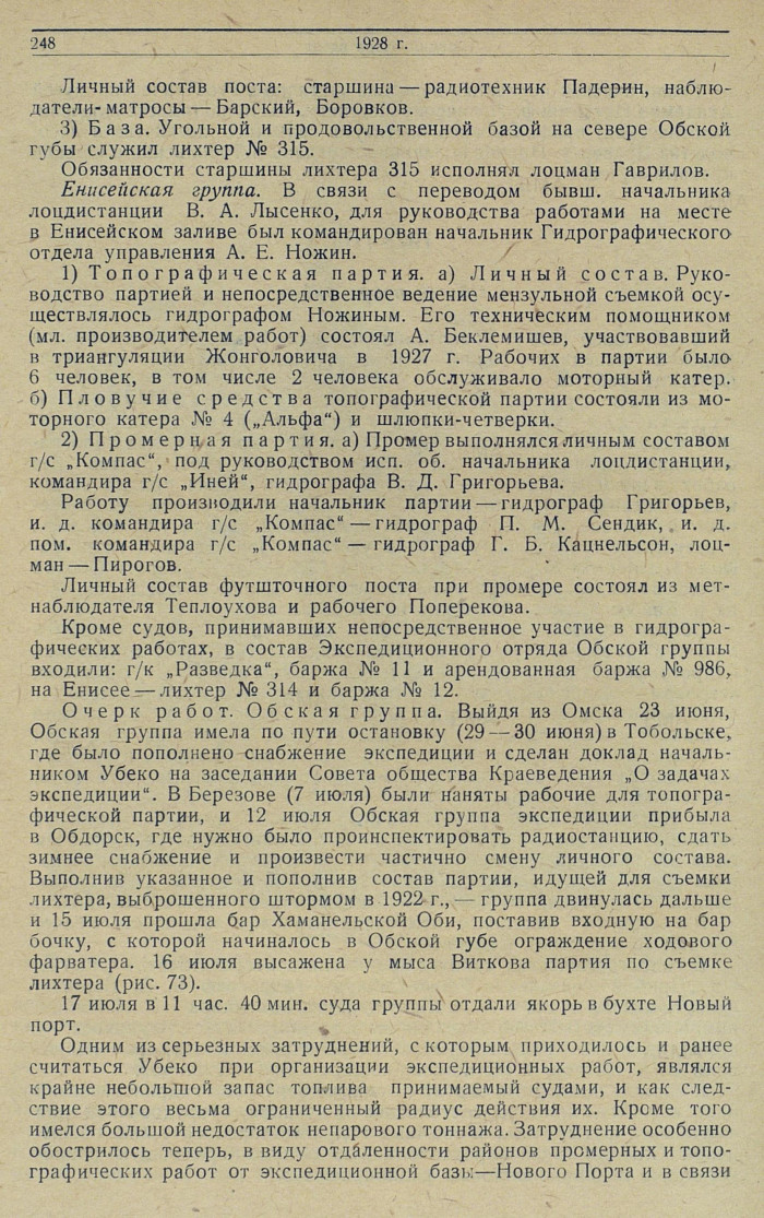 Состав групп, выделенных из экспедиционного отряда для производства гидрографических работ. Для выполнения съемочных работ были сформированы две топографические партии: одна для работ в Обской губе, другая для работ в низовьях Енисея. — К партии Обского района придан астроном с техническим помощником. На р. Енисее астрономо-геодезическое основание для производства мензульной съемки уже имелось, в результате триангуляции на этом участке, произведенной гидрографом-геодезистом И. Д. Жонголовичем в 1927 г. Для промера в Обской губе были выделены гидрографические суда — „Прибой" и „Неупокоев"; на р. Енисее промер возлагался на г/с „Компас".