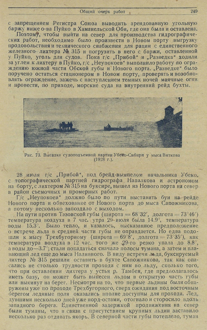 1928 ГОДОбщий очерк работВ навигацию 1928 г. Убеко-Сибири, помимо обычного обслуживания Карской экспедиции, радио- и гиместанций, производило гидрографические работы.