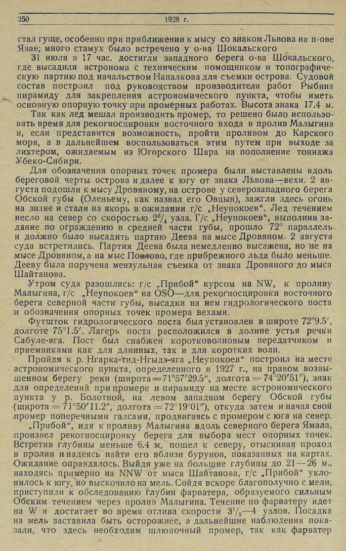 „Прибой", идя к проливу Малыгина вдоль северного берега Ямала, произвел рекогносцировку берега для выбора мест опорных точек. Встретив глубины меньше 6.4 м, пошел к северу, отыскивая проход в пролив и надеясь найти его вблизи бурунов, показанных на картах. Ожидание оправдалось. Выйдя уже на большие глубины до 21 — 26 м., находясь примерно на NNW от мыса Шайтанова, г/с „Прибой" уклонилось к югу, но выскочило на мель. Сойдя вскоре благополучно с мели, приступили к обследованию глубин фарватера, образуемого сильным Обским течением через пролив Малыгина. Течение по фарватеру идет на W и достигает во время отлива скорости 3 1/2—4 узлов. Посадка на мель заставила быть осторожнее, а дальнейшие наблюдения показали, что здесь необходим шлюпочный промер, так как фарватер