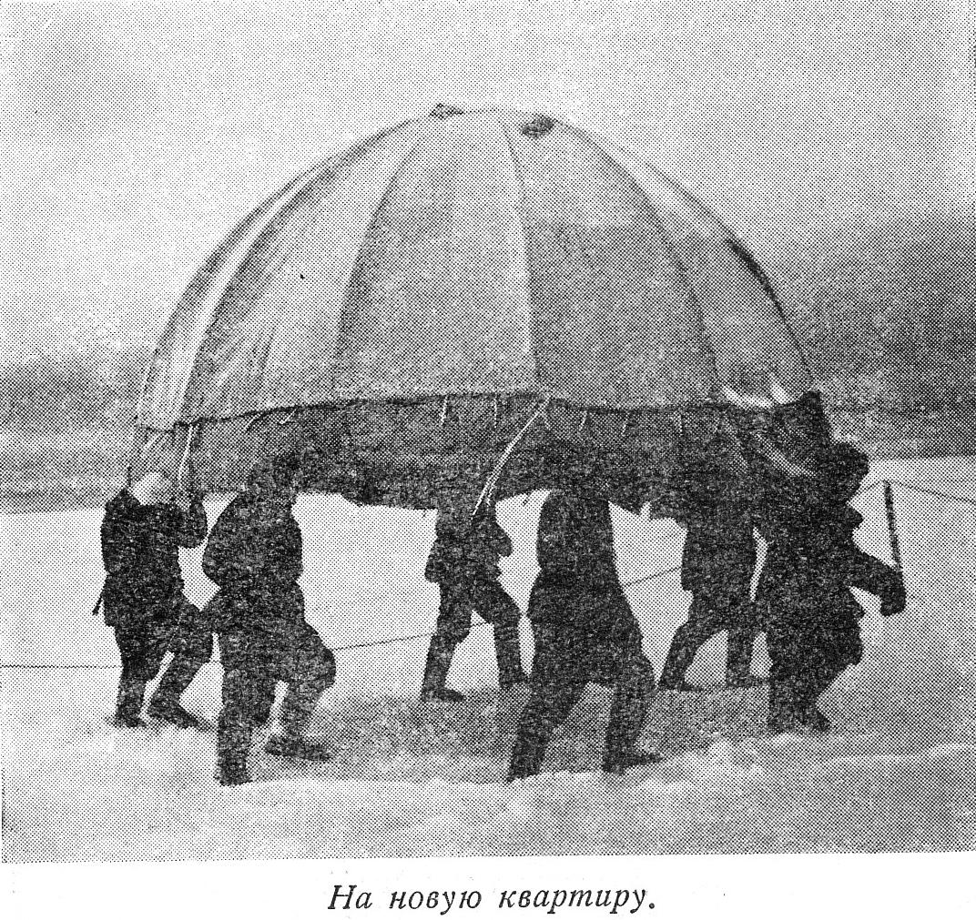 Темно, но электростанция работает бесперебойно. На открытых площадках научных павильонов, у гидрологических лунок, на метеоплощадке часто вспыхивают яркие лучи прожекторных ламп. Уютно светятся иллюминаторы домиков, выстроившихся в два ряда, а над лагерем гордо развевается алый государственный флаг Советского Союза.