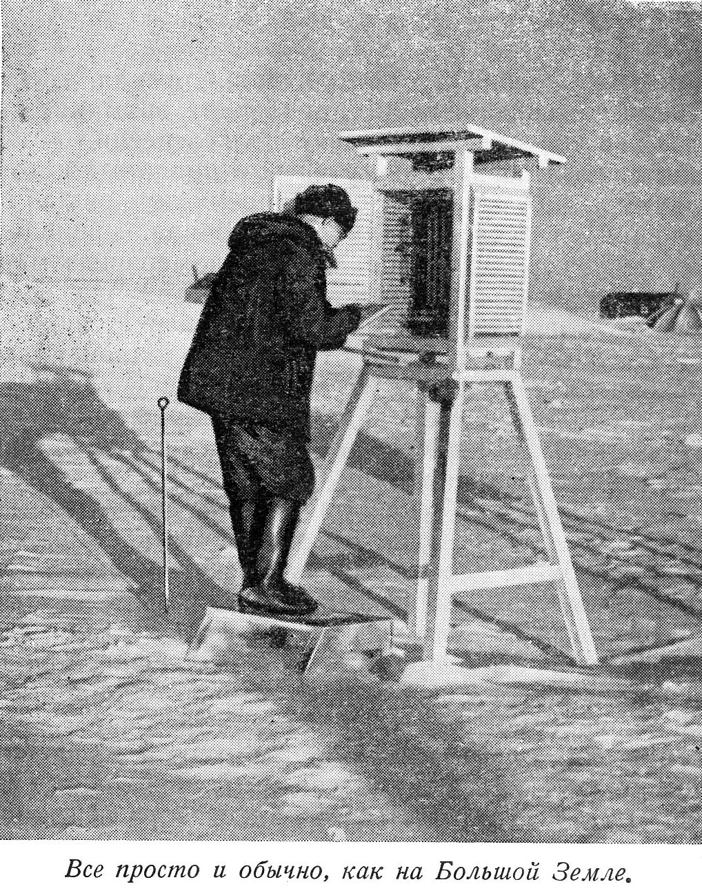 Как упоминалось выше, в программу работы станции входило ежедневное измерение глубин океана. Гидрологическая палатка располагалась в 600 м от лагеря, на припайном многолетнем льду толщиной около 4 м. Зима 1958-59 г. на нашем ледяном острове была очень снежной, поэтому к палатке, поставленной над лункой, каждый раз приходилось прокапывать снежный тоннель.