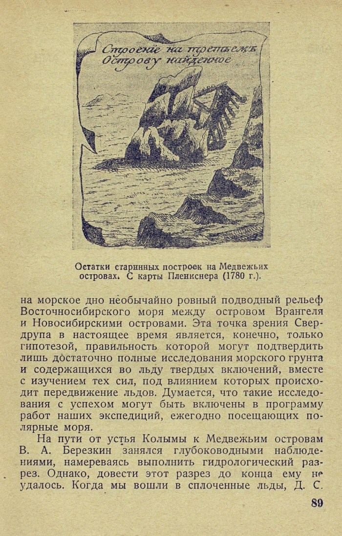 Первым русским, посетившим Медвежьи острова, был промышленник Иван Вилегин. Около 1720 года он перешел на эти острова по льду из устья Колымы. Интересно, что Вилегин нашел на Медвежьих островах следы пребывания человека: «приметил он старые юрты и признаки, где прежде юрты стояли, а какие люди там жили, о том он не ведает». В 1763 году Медвежьи острова посетил сержант Андреев, который также видел там развалины туземных построек: «нашли из наносного лесу построенную, но уже развалившуюся юрту, и по строению ее заключить могли, что она строена не топором, но каким-нибудь костяным орудием». {1} Почти все путешественники, побывавшие на Медвежьих островах в последующее время, также сообщали о найденных там следах древнего туземного населения. Так, экспедицией на «Мод» в 1925 году,