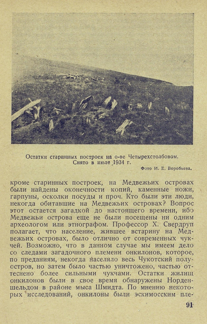 кроме старинных построек, на Медвежьих островах были найдены оконечности копий, каменные ножи, гарпуны, осколки посуды и проч. Кто были эти люди, некогда обитавшие на Медвежьих островах? Вопрос этот остается загадкой до настоящего времени, ибо Медвежьи острова еще не были посещены ни одним археологом или этнографом. Профессор X. Свердруп полагает, что население, жившее встарину на Медвежьих островах, было отлично от современных чукчей. Возможно, что в данном случае мы имеем дело со следами загадочного племени онкилонов, которое, по преданиям, некогда Населяло весь Чукотский полуостров, но затем было частью уничтожено, частью оттеснено более сильными чукчами. Остатки жилищ онкилонов были в свое время обнаружены Норденшельдом в районе мыса Шмидта. По мнению некоторых исследований, онкилоны были эскимосским пле-