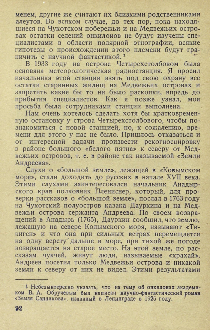 {1} Небезынтересно указать, что на тему об онкилонах академиком В. А. Обручевым был написан научно-фантастический роман «Земля Санникова», изданный в Ленинграде в 1926 году.[92]
