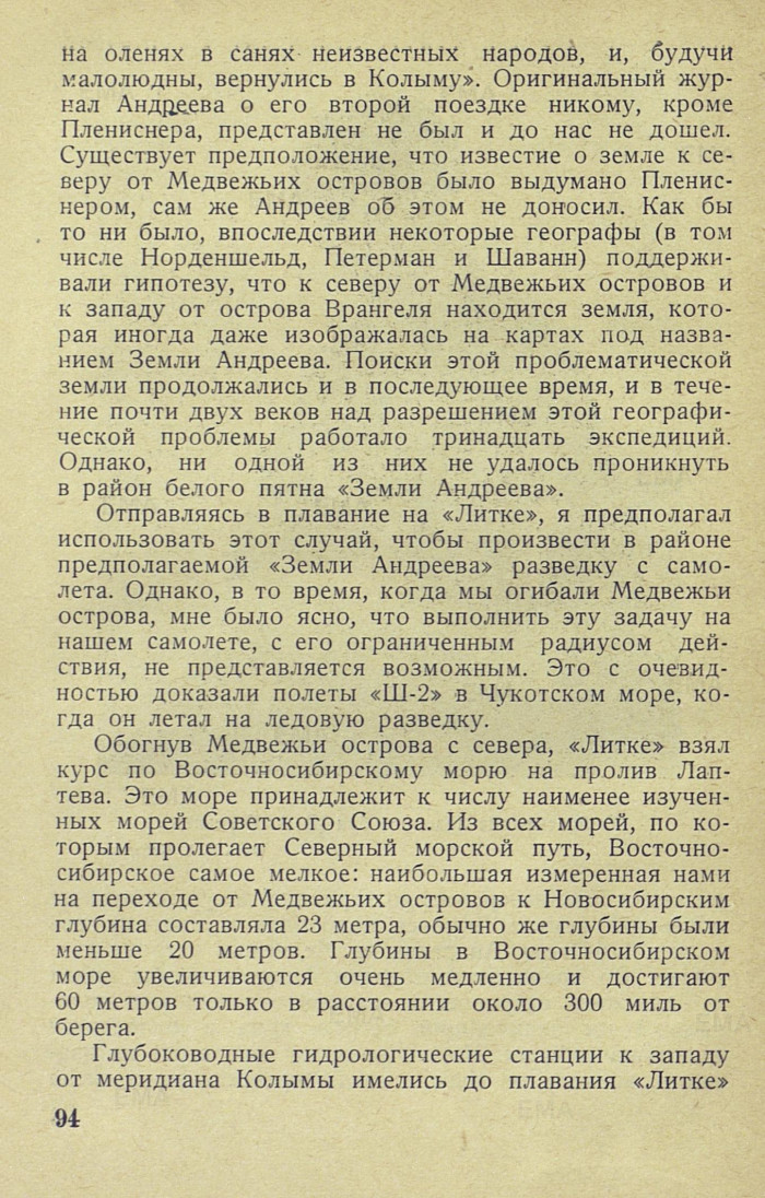 Отправляясь в плавание на «Литке», я предполагал использовать этот случай, чтобы произвести в районе предполагаемой «Земли Андреева» разведку с самолета. Однако, в то время, когда мы огибали Медвежьи острова, мне было ясно, что выполнить эту задачу на нашем самолете, с его ограниченным радиусом действия, не представляется возможным. Это с очевидностью доказали полеты «Ш-2» в Чукотском море, когда он летал на ледовую разведку.