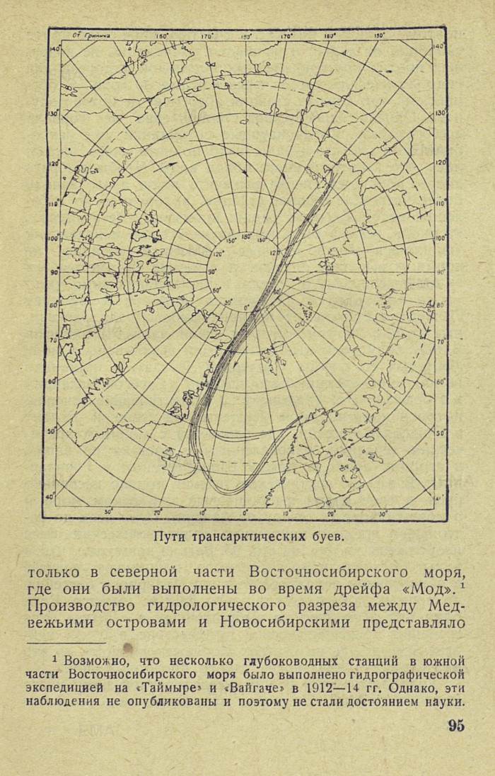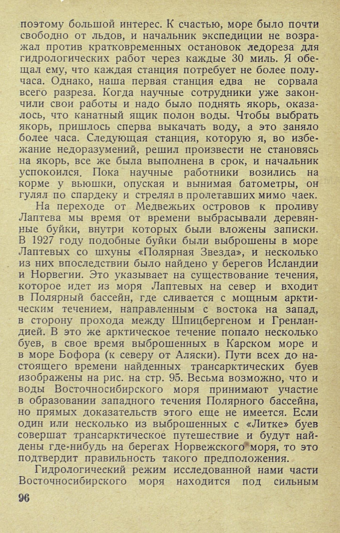 На переходе от Медвежьих островов к проливу Лаптева мы время от времени выбрасывали деревянные буйки, внутри которых были вложены записки. В 1927 году подобные буйки были выброшены в море Лаптевых со шхуны «Полярная Звезда», и несколько из них впоследствии было найдено у берегов Исландии и Норвегии. Это указывает на существование течения, которое идет из моря Лаптевых на север и входит в Полярный бассейн, где сливается с мощным арктическим течением, направленным с востока на запад, в сторону прохода между Шпицбергеном и Гренландией. В это же арктическое течение попало несколько буев, в свое время выброшенных в Карском море и в море Бофора (к северу от Аляски). Пути всех до настоящего времени найденных трансарктических буев изображены на рис. на стр. 95. Весьма возможно, что и воды Восточносибирского моря принимают участие в образовании западного течения Полярного бассейна, но прямых доказательств этого еще не имеется. Если один или несколько из выброшенных с «Литке» буев совершат трансарктическое путешествие и будут найдены где-нибудь на берегах Норвежского моря, то это подтвердит правильность такого предположения.