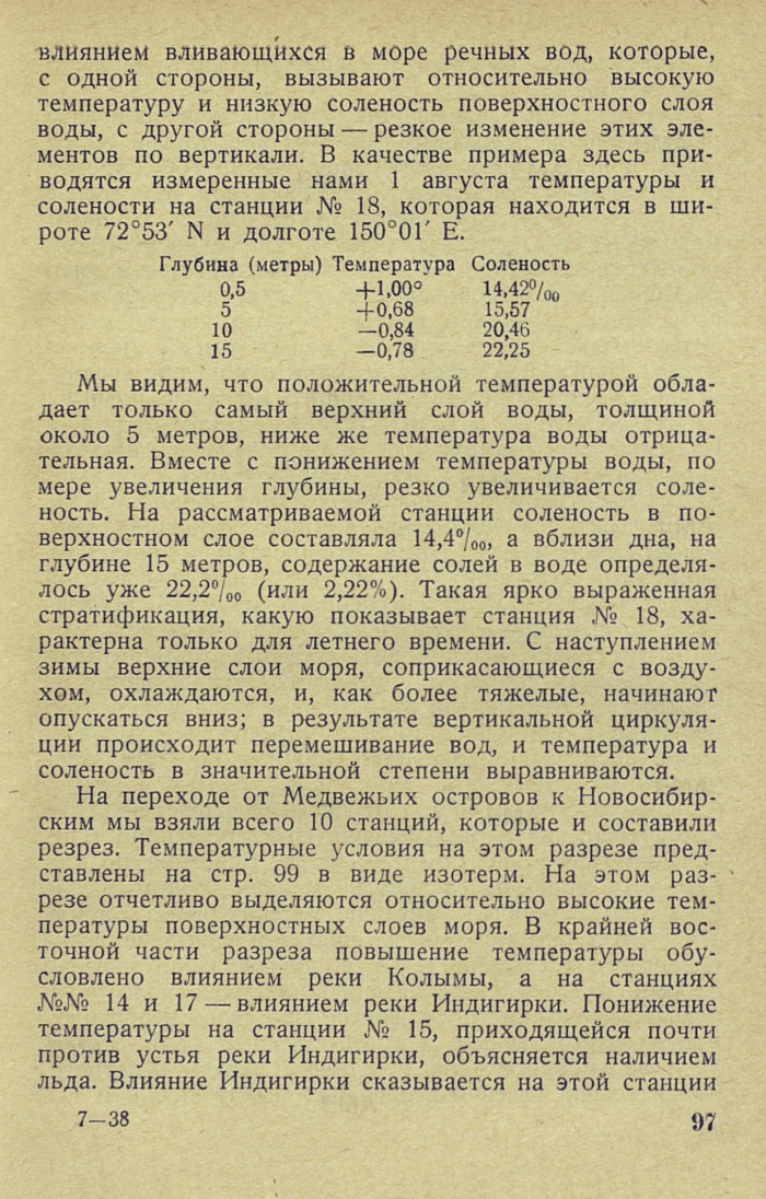 влиянием вливающихся в море речных вод, которые, с одной стороны, вызывают относительно высокую температуру и низкую соленость поверхностного слоя воды, с другой стороны — резкое изменение этих элементов по вертикали. В качестве примера здесь приводятся измеренные нами 1 августа температуры и солености на станции № 18, которая находится в широте 72°53' N и долготе 150°01' Е.