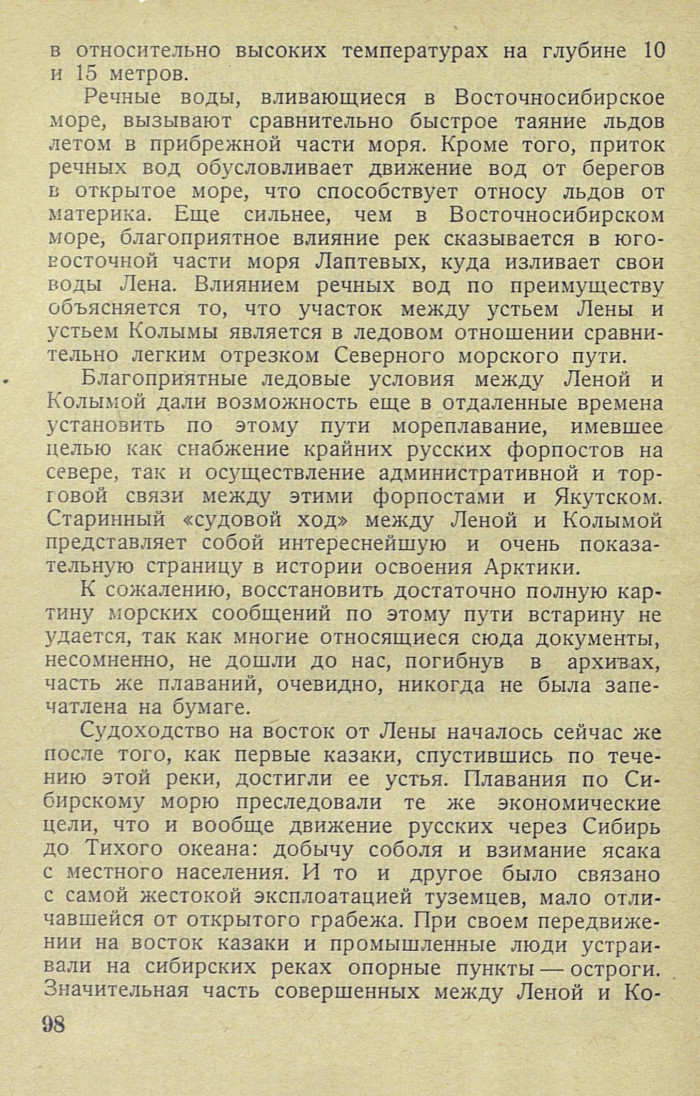 Благоприятные ледовые условия между Леной и Колымой дали возможность еще в отдаленные времена установить по этому пути мореплавание, имевшее целью как снабжение крайних русских форпостов на севере, так и осуществление административной и торговой связи между этими форпостами и Якутском. Старинный «судовой ход» между Леной и Колымой представляет собой интереснейшую и очень показательную страницу в истории освоения Арктики.