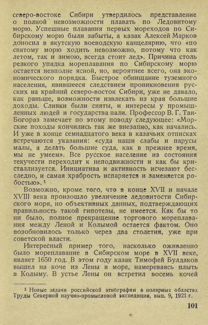 северо-востоке Сибири утвердилось представление о полной невозможности плавать по Ледовитому морю. Успешные плавания первых мореходов по Сибирскому морю были забыты, а казак Алексей Марков доносил в якутскую воеводскую канцелярию, что «по святому морю ходить невозможно, потому что как летом, так и зимою, всегда стоит лед». Причина столь резкого упадка мореплавания по Сибирскому морю остается не вполне ясной, но, вероятнее всего, она экономического порядка. Быстрое обнищание туземного населения, явившееся следствием проникновения русских на крайний северо-восток Сибири, уже не давало, как раньше, возможности извлекать из края большие доходы. Сливки были сняты, и интересы у промышленных людей и государства пали. Профессор В. Г. Тан-Богораз замечает по этому поводу следующее: «Морские походы кончились так же внезапно, как начались. И уже в конце семнадцатого века в казачьих отписках встречаются указания: «суда наши слабы и парусы малы, а делать большие суда, как в прежнее время, мы не умеем». Все русское население из состояния текучести переходит к неподвижности и как бы кристаллизуется. Инициатива и активность исчезают бесследно, и самая храбрость испаряется и заменяется робостью». {1}
