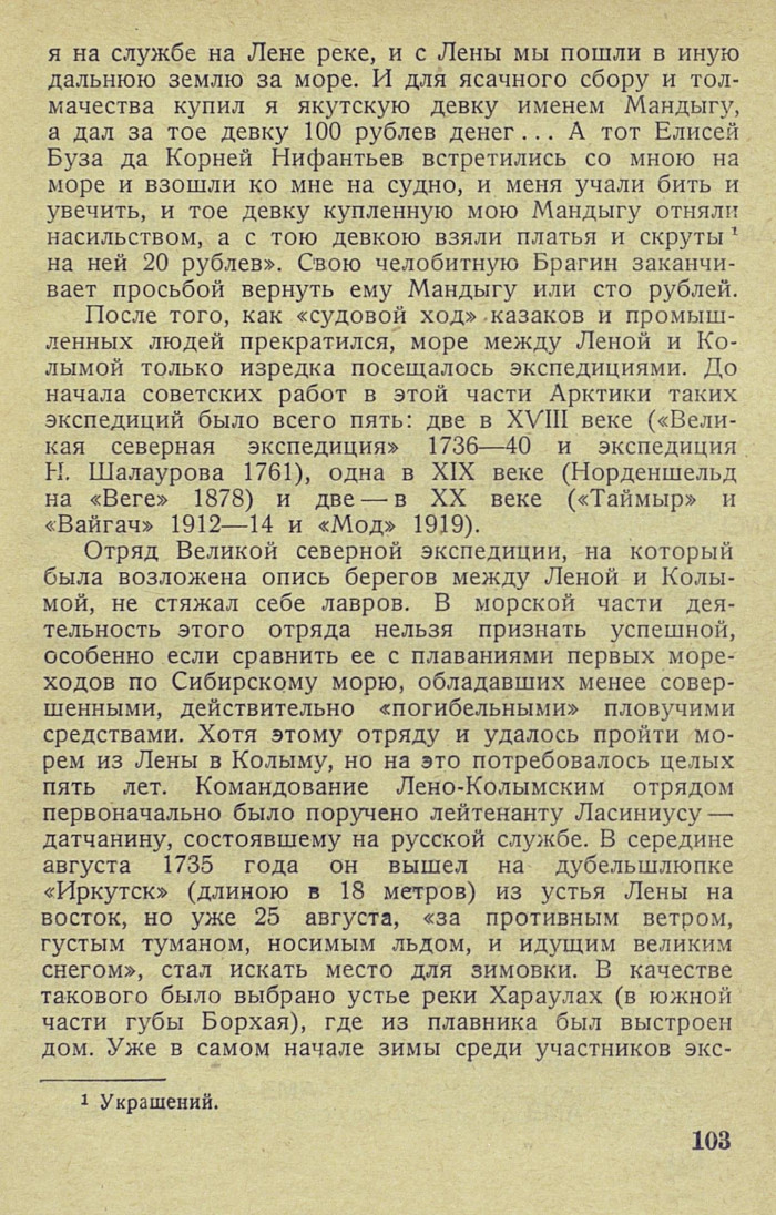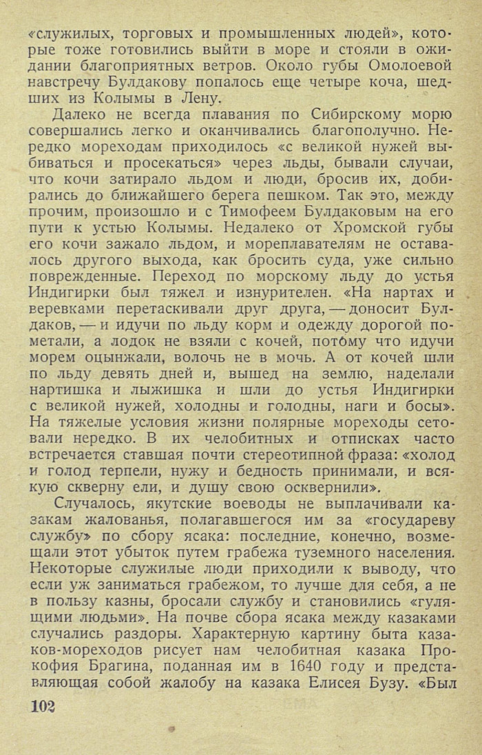 Судоходство на восток от Лены началось сейчас же после того, как первые казаки, спустившись по течению этой реки, достигли ее устья. Плавания по Сибирскому морю преследовали те же экономические цели, что и вообще движение русских через Сибирь до Тихого океана: добычу соболя и взимание ясака с местного населения. И то и другое было связано с самой жестокой эксплоатацией туземцев, мало отличавшейся от открытого грабежа. При своем передвижении на восток казаки и промышленные люди устраивали на сибирских реках опорные пункты — остроги. Значительная часть совершенных между Леной и Ко-