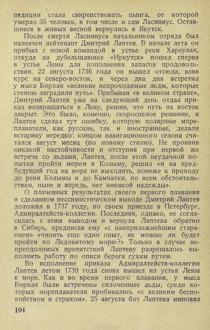 После смерти Ласиниуса начальником отряда был назначен лейтенант Дмитрий Лаптев. В начале лета он прибыл с новой командой в устье реки Хараулах, откуда на дубель-шлюпке «Иркутск» пошел сперва в устье Лены для пополнения запасов продовольствия. 22 августа 1736 года он вышел отсюда, взяв курс на северо-восток, и через два дня встретил у мыса Борхая «великие непроходимые льды, которые стеною заградили путь». Пребывая «в великом страхе», Дмитрий Лаптев уже на следующий день отдал приказ возвращаться в Лену, решив, что путь на восток закрыт. Это было, конечно, скороспелое решение, и Лаптев сделал тут ошибку, которую полярные мореплаватели, как русские, так и иностранные, делали встарину нередко: концом навигационного сезона считался август месяц (по новому стилю). Не проявив никакой настойчивости и отступив при первой же встрече со льдами, Лаптев, после этой неудачной попытки пройти морем в Колыму, решил «и на предбудущий год на море не выходить, понеже к проходу до реки Колымы и до Камчатки, по всем обстоятельствам, ныне и впредь, нет никакой надежды».