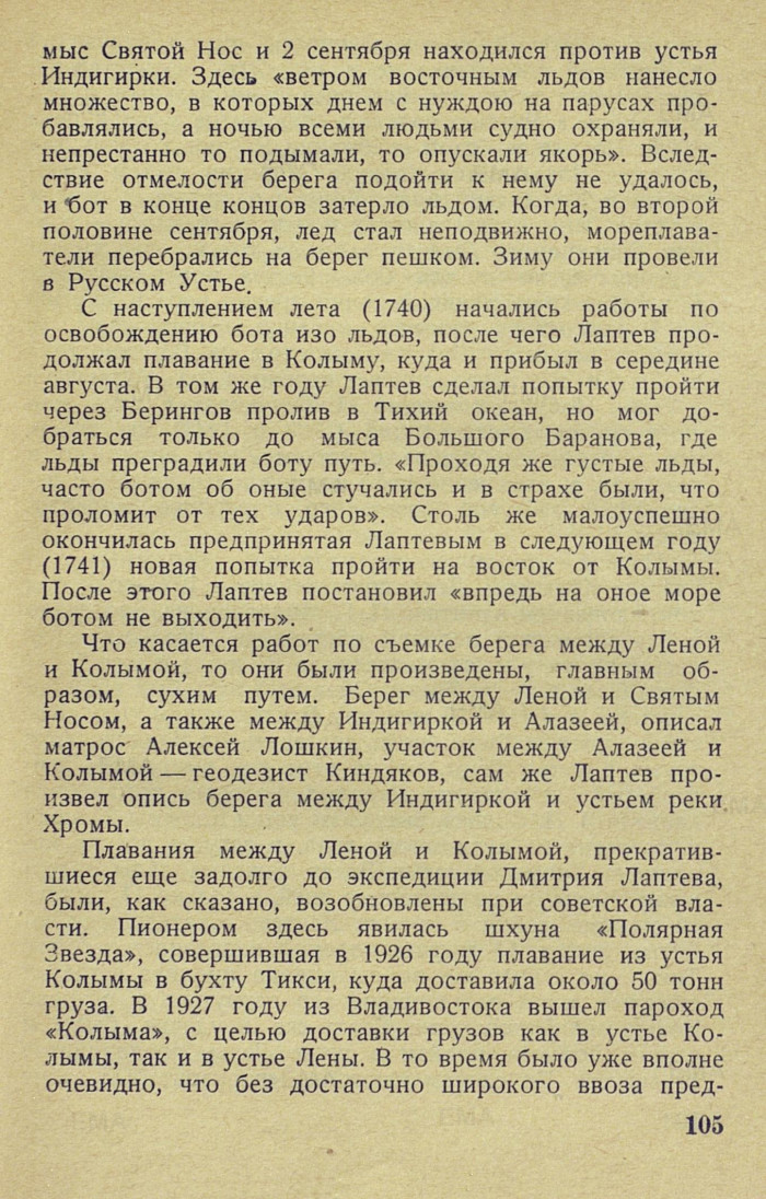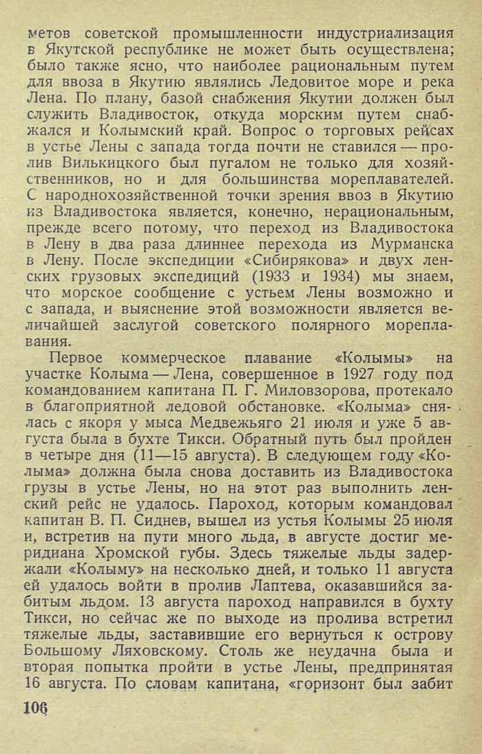 метов советской промышленности индустриализация в Якутской республике не может быть осуществлена; было также ясно, что наиболее рациональным путем для ввоза в Якутию являлись Ледовитое море и река Лена. По плану, базой снабжения Якутии должен был служить Владивосток, откуда морским путем снабжался и Колымский край. Вопрос о торговых рейсах в устье Лены с запада тогда почти не ставился — пролив Вилькицкого был пугалом не только для хозяйственников, но и для большинства мореплавателей. С народнохозяйственной точки зрения ввоз в Якутию из Владивостока является, конечно, нерациональным, прежде всего потому, что переход из Владивостока в Лену в два раза длиннее перехода из Мурманска в Лену. После экспедиции «Сибирякова» и двух ленских грузовых экспедиций (1933 и 1934) мы знаем, что морское сообщение с устьем Лены возможно и с запада, и выяснение этой возможности является величайшей заслугой советского полярного мореплавания.