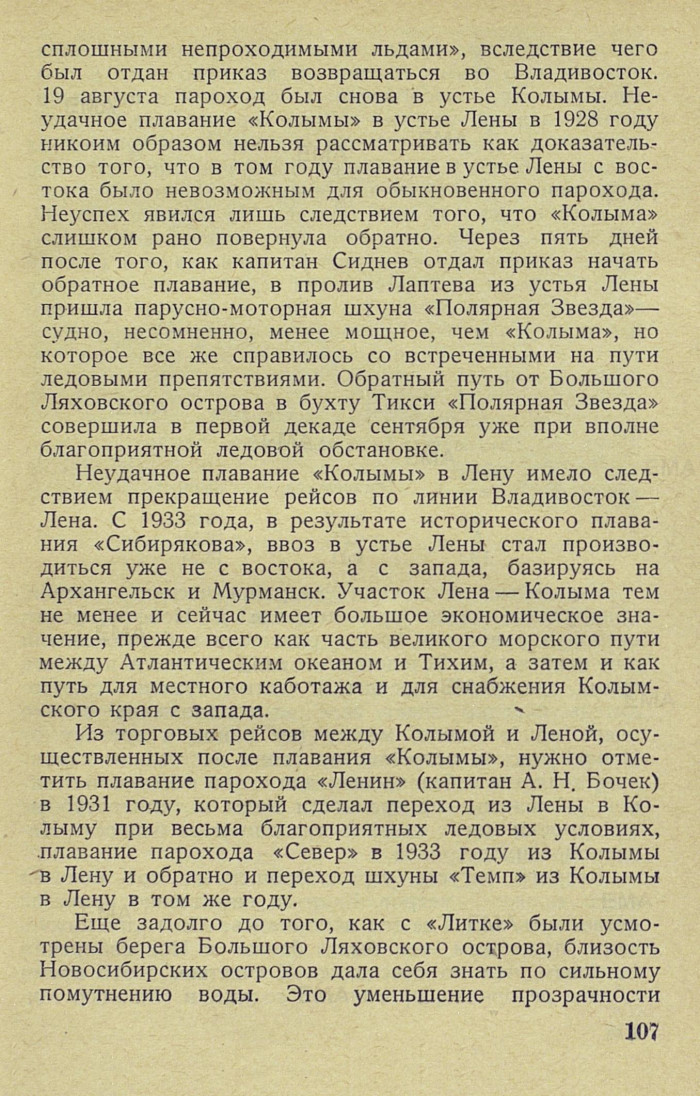 сплошными непроходимыми льдами», вследствие чего был отдан приказ возвращаться во Владивосток. 19 августа пароход был снова в устье Колымы. Неудачное плавание «Колымы» в устье Лены в 1928 году никоим образом нельзя рассматривать как доказательство того, что в том году плавание в устье Лены с востока было невозможным для обыкновенного парохода. Неуспех явился лишь следствием того, что «Колыма» слишком рано повернула обратно. Через пять дней после того, как капитан Сиднев отдал приказ начать обратное плавание, в пролив Лаптева из устья Лены пришла парусно-моторная шхуна «Полярная Звезда»— судно, несомненно, менее мощное, чем «Колыма», но которое все же справилось со встреченными на пути ледовыми препятствиями. Обратный путь от Большого Ляховского острова в бухту Тикси «Полярная Звезда» совершила в первой декаде сентября уже при вполне благоприятной ледовой обстановке.