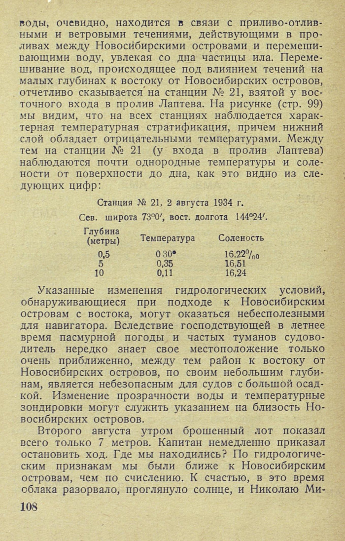 воды, очевидно, находится в связи с приливо-отливными и ветровыми течениями, действующими в проливах между Новосибирскими островами и перемешивающими воду, увлекая со дна частицы ила. Перемешивание вод, происходящее под влиянием течений на малых глубинах к востоку от Новосибирских островов, отчетливо сказывается на станции № 21, взятой у восточного входа в пролив Лаптева. На рисунке (стр. 99) мы видим, что на всех станциях наблюдается характерная температурная стратификация, причем нижний слой обладает отрицательными температурами. Между тем на станции № 21 (у входа в пролив Лаптева) наблюдаются почти однородные температуры и солености от поверхности до дна, как это видно из следующих цифр:
