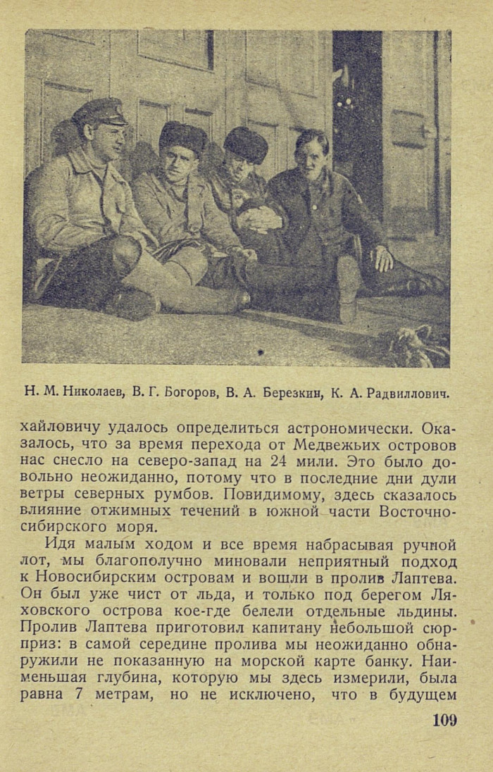 Обогнув Медвежьи острова с севера, «Литке» взял курс по Восточносибирскому морю на пролив Лаптева. Это море принадлежит к числу наименее изученных морей Советского Союза. Из всех морей, по которым пролегает Северный морской путь, Восточносибирское самое мелкое: наибольшая измеренная нами на переходе от Медвежьих островов к Новосибирским глубина составляла 23 метра, обычно же глубины были меньше 20 метров. Глубины в Восточносибирском море увеличиваются очень медленно и достигают 60 метров только в расстоянии около 300 миль от берега.