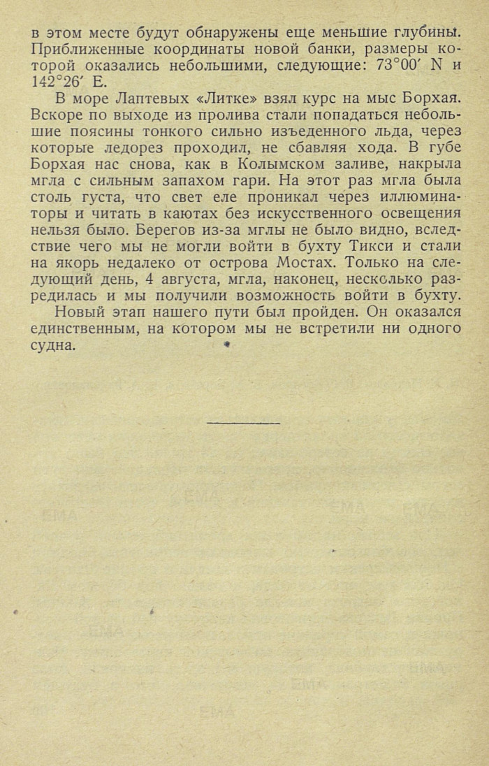 В море Лаптевых «Литке» взял курс на мыс Борхая. Вскоре по выходе из пролива стали попадаться небольшие поясины тонкого сильно изъеденного льда, через которые ледорез проходил, не сбавляя хода. В губе Борхая нас снова, как в Колымском заливе, накрыла мгла с сильным запахом гари. На этот раз мгла была столь густа, что свет еле проникал через иллюминаторы и читать в каютах без искусственного освещения нельзя было. Берегов из-за мглы не было видно, вследствие чего мы не могли войти в бухту Тикси и стали на якорь недалеко от острова Мостах. Только на следующий день, 4 августа, мгла, наконец, несколько разредилась и мы получили возможность войти в бухту.