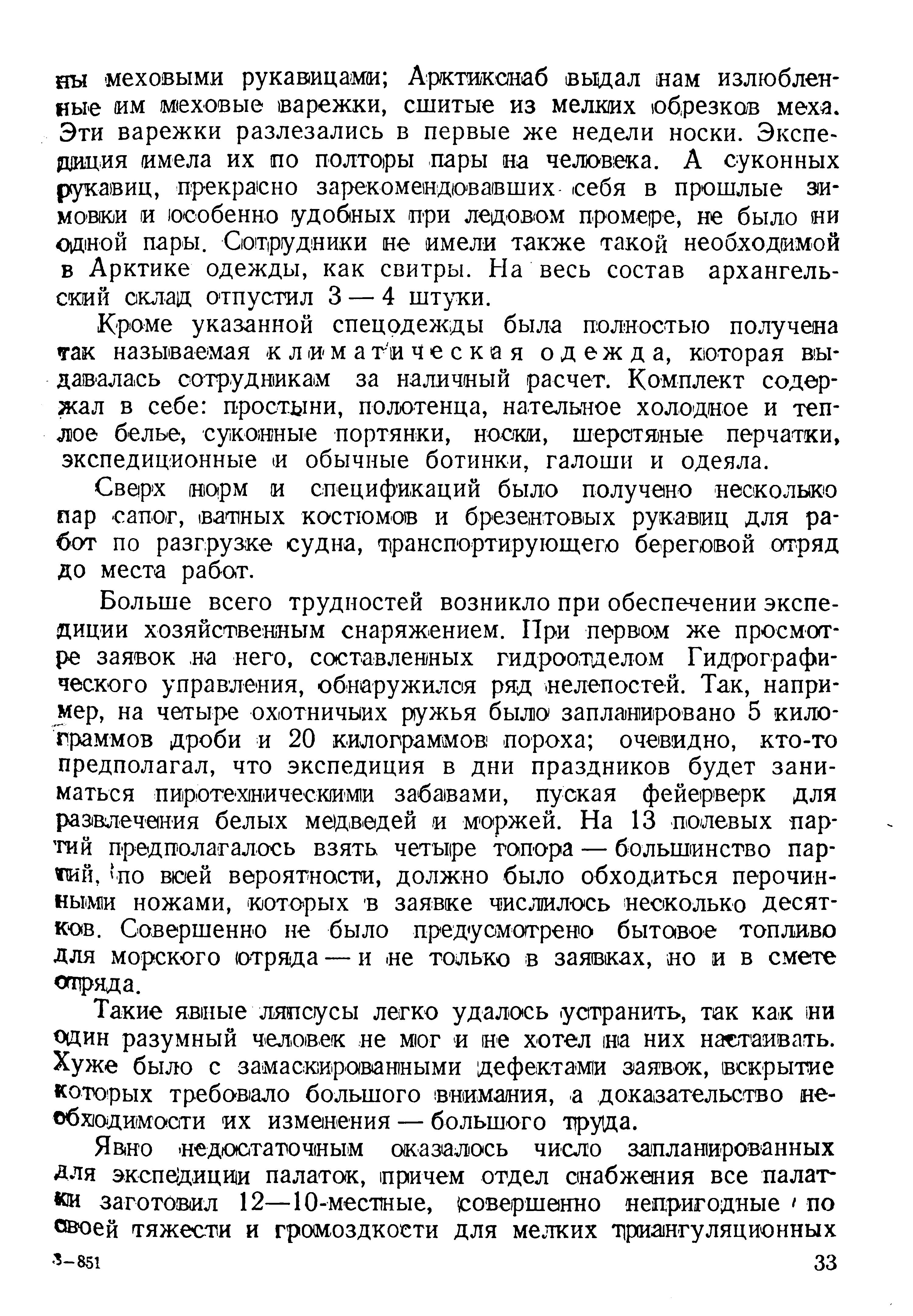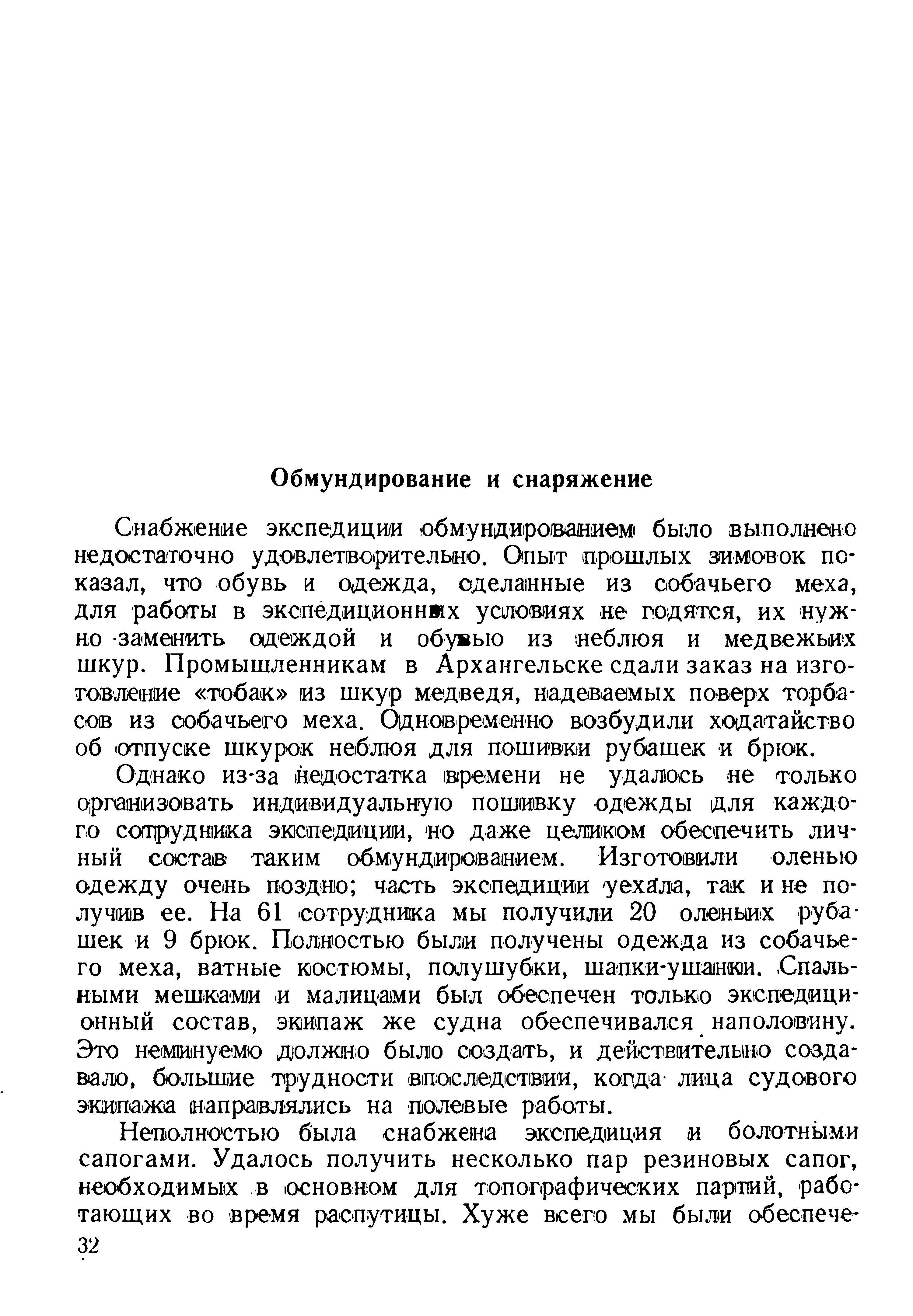 Однако из-за недостатка времени не удалось не только организовать индивидуальную пошивку одежды для каждого сотрудника экспедиции, но даже целиком обеспечить личный состав таким обмундированием. Изготовили оленью одежду очень поздно; часть экспедиции уехала, так и не получив ее. На 61 сотрудника мы получили 20 оленьих рубашек и 9 брюк. Полностью были получены одежда из собачьего меха, ватные костюмы, полушубки, шапки-ушанки. Спальными мешками и малицами был обеспечен только экспедиционный состав, экипаж же судна обеспечивался наполовину. Это неминуемо должно было создать, и действительно создавало, большие трудности впоследствии, когда лица судового экипажа направлялись на полевые работы.