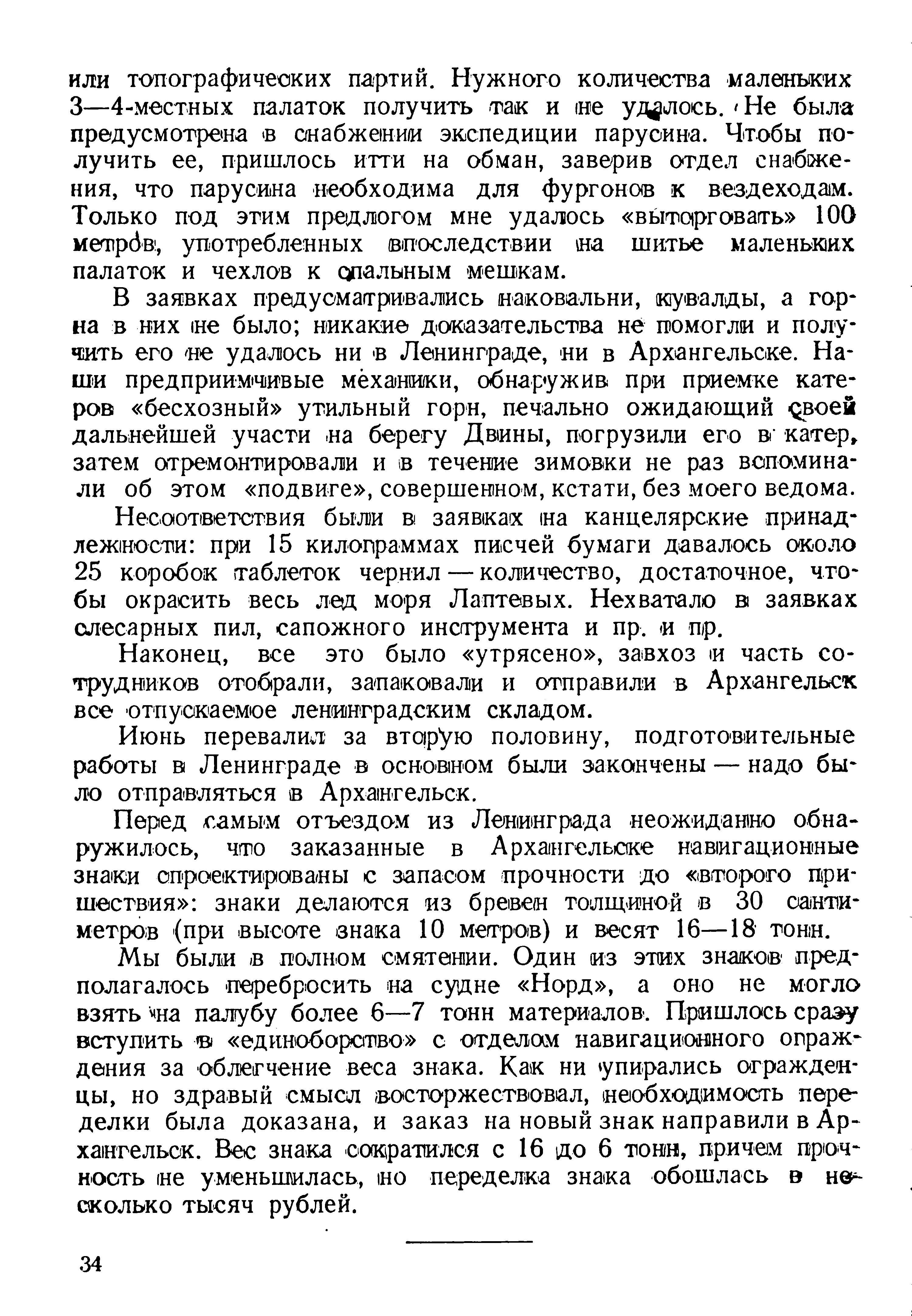 Несоответствия были в заявках на канцелярские принадлежности: при 15 килограммах писчей бумаги давалось около 25 коробок таблеток чернил — количество, достаточное, чтобы окрасить весь лед моря Лаптевых. Не хватало в заявках слесарных пил, сапожного инструмента и пр. и пр.